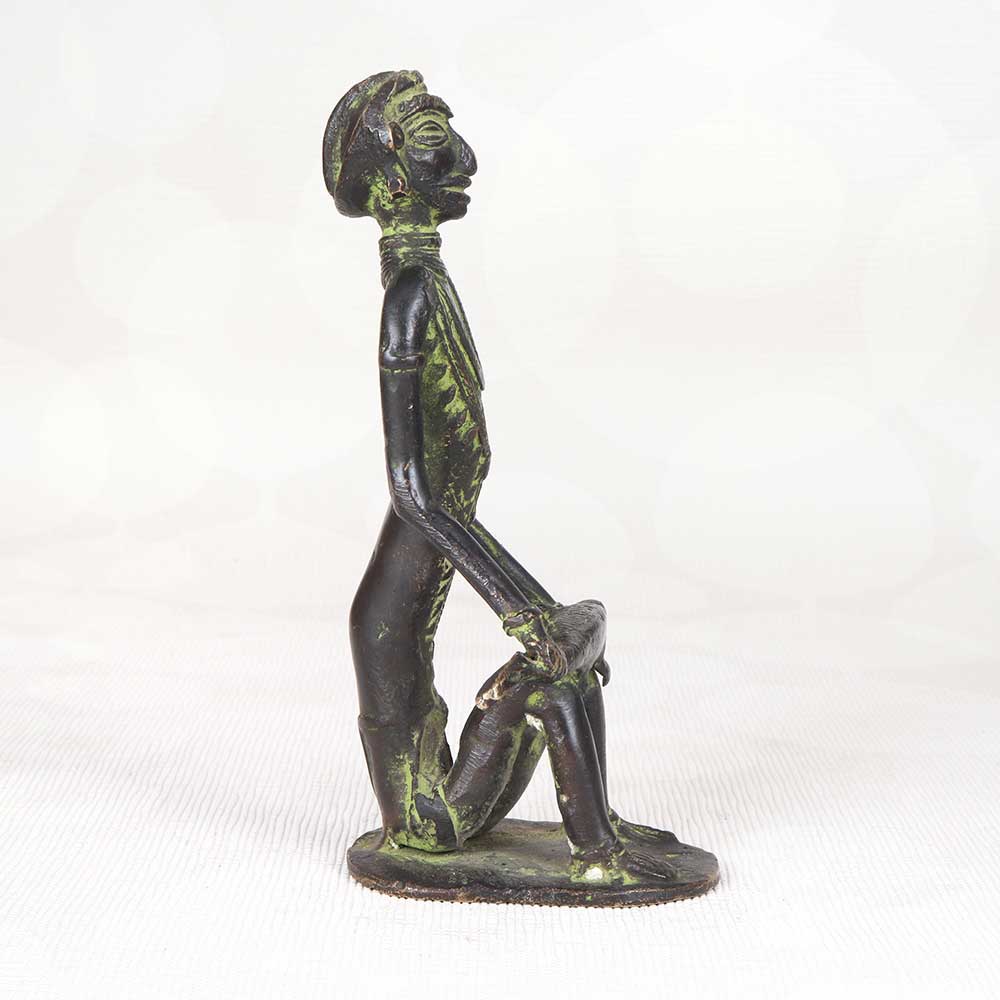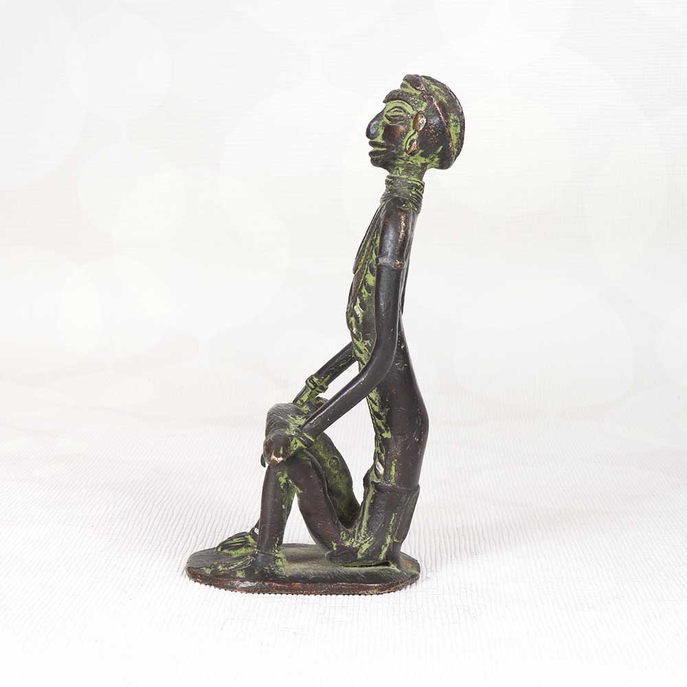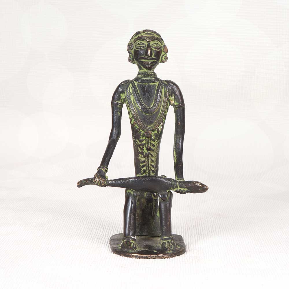 - Beautifully detailed brass casting depicts a tribal man sitting cross-legged while holding up a large fish