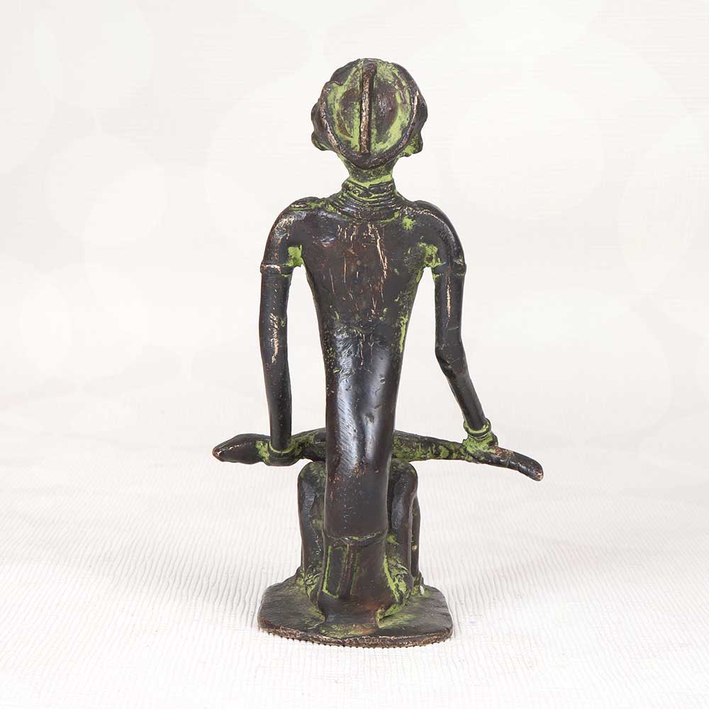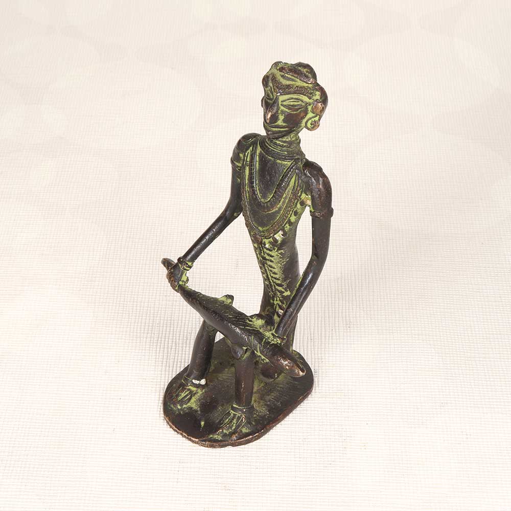 Add a rustic, tribal touch to your home decor with this stunning brass statue of a sitting tribal man holding a fish. With its intricate handcrafted details and antique patina finish, this statue is sure to be a conversation starter. This tribal man statue channels the rich cultural history of Bastar tribal art through its exquisite details like the man's ornate jewelry and headgear. Place it in an entryway or living room to welcome guests with its warm, earthy presence. The vintage finish adds charm and character to any space while paying homage to Bastar's tribal artisanship. Give your home a touch of global, bohemian style with this striking brass statue.