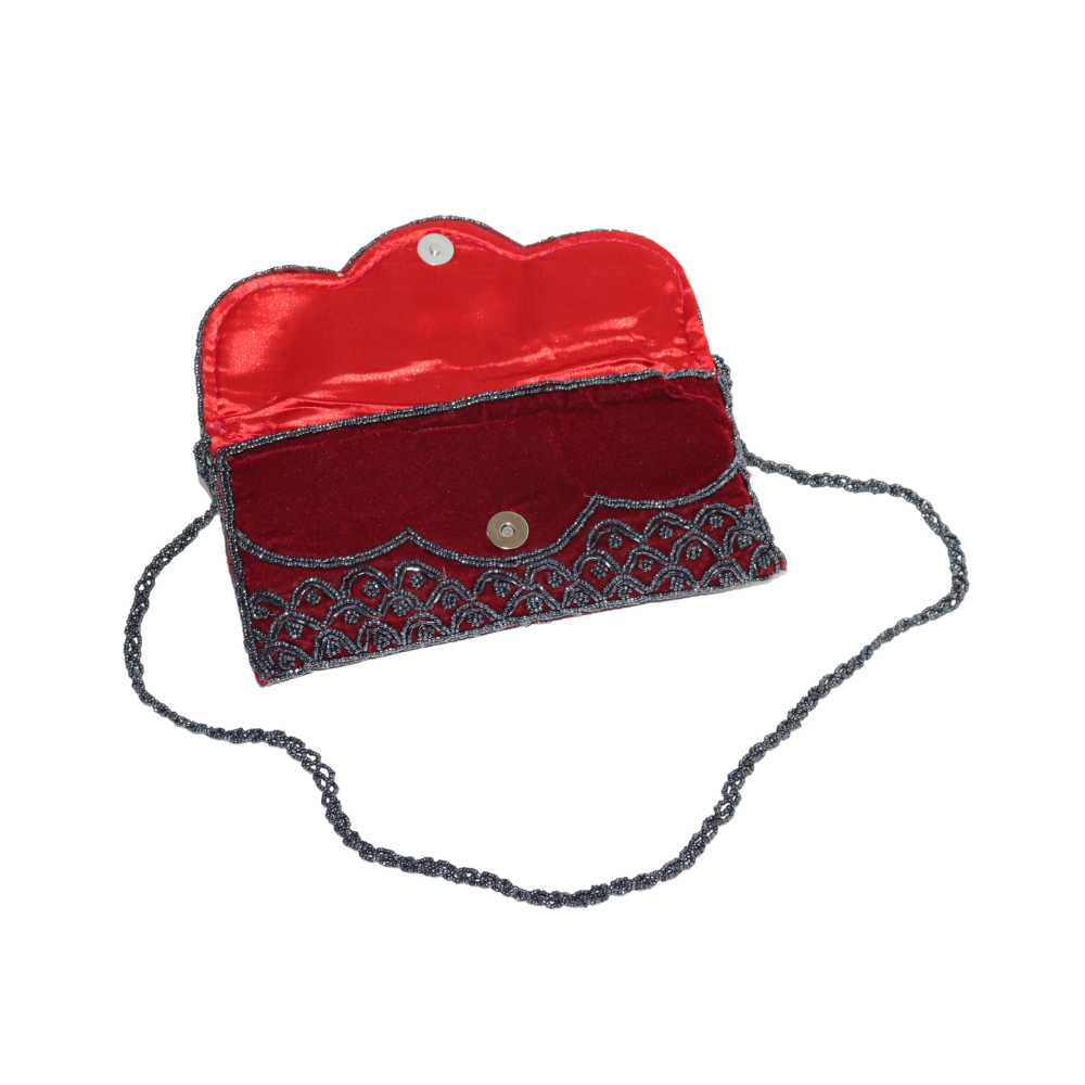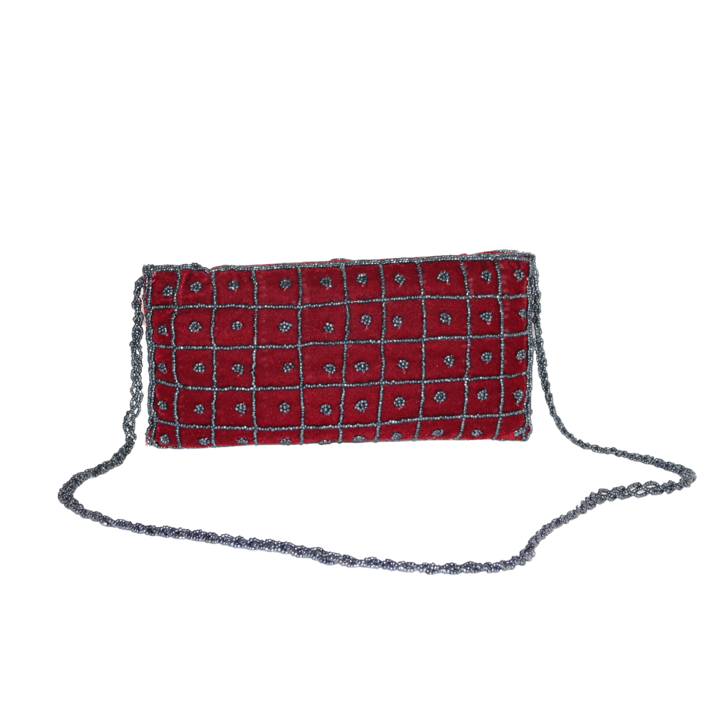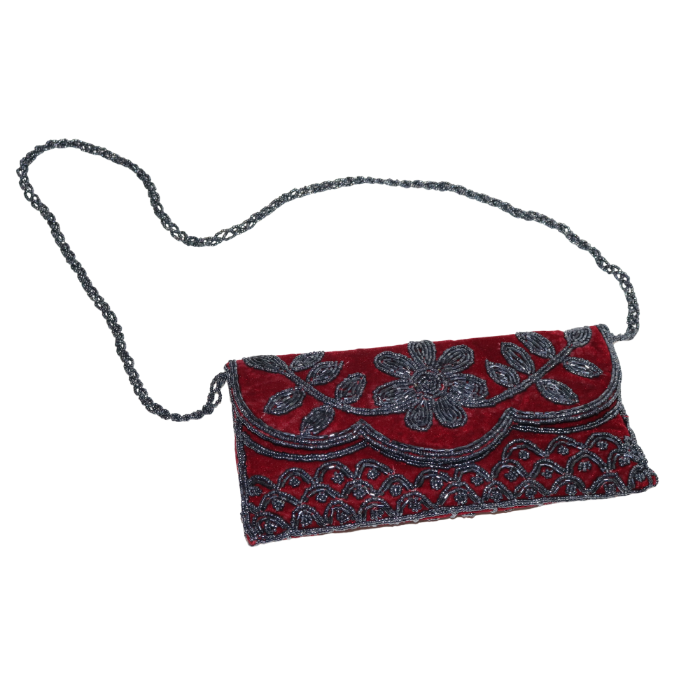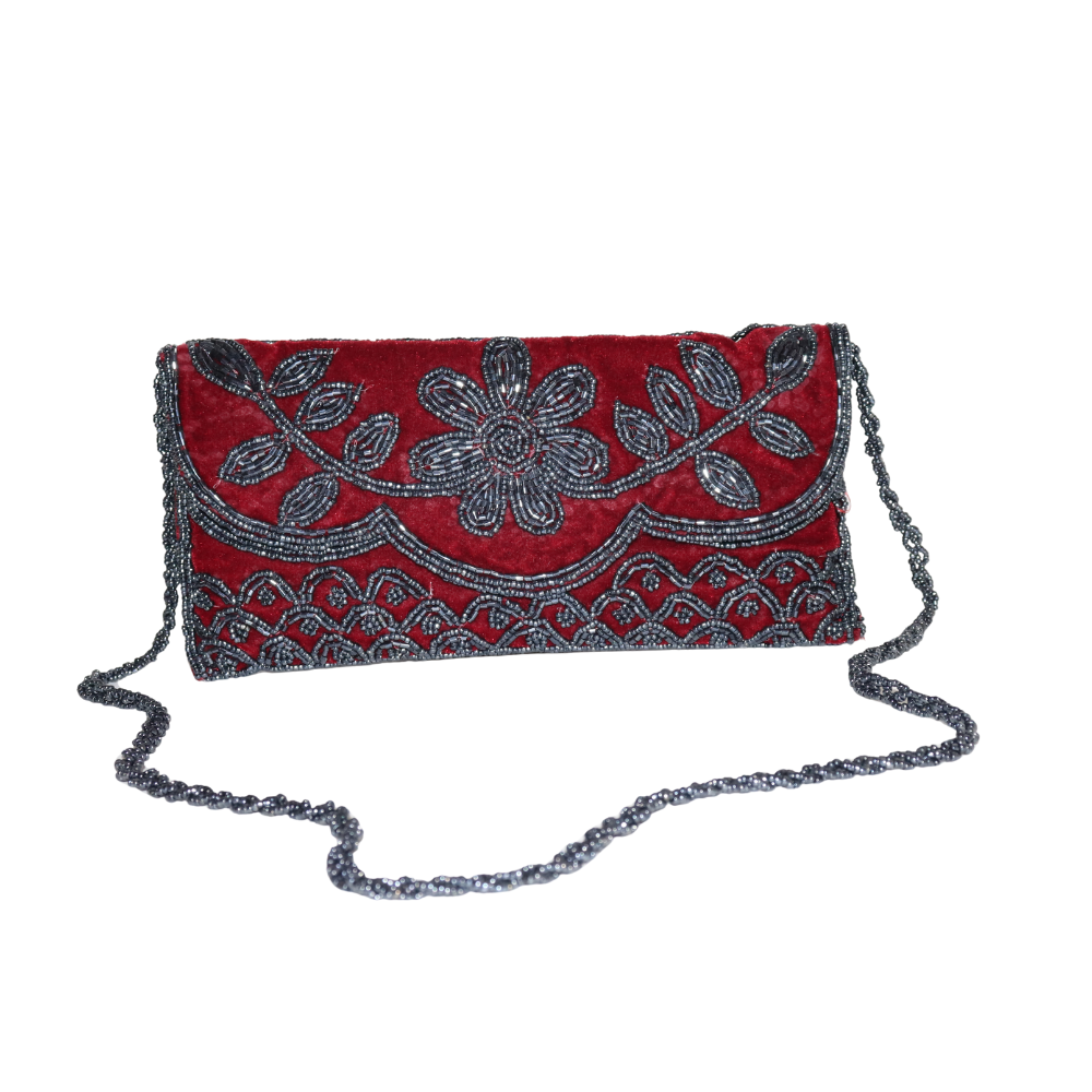 Add a touch of luxury to your collection with this handmade velvet clutch, designed with intricate beadwork that enhances its rich red hue. Featuring a stunning floral design in shades of dark gray and silver, this clutch is the perfect accessory for an evening event, wedding, or formal occasion. The soft velvet fabric provides a sophisticated look, while the detailed beading offers a stylish contrast and a hint of sparkle. Equipped with a detachable chain strap for easy carrying, this clutch is both practical and elegant. Its compact size allows you to store all your essentials like a phone, cards, and makeup. Handcrafted with care, this beaded clutch combines artistry with functionality, making it an ideal gift or a statement piece to complement your outfit. Don't miss out on this unique, luxurious accessory that is sure to turn heads and elevate any look.