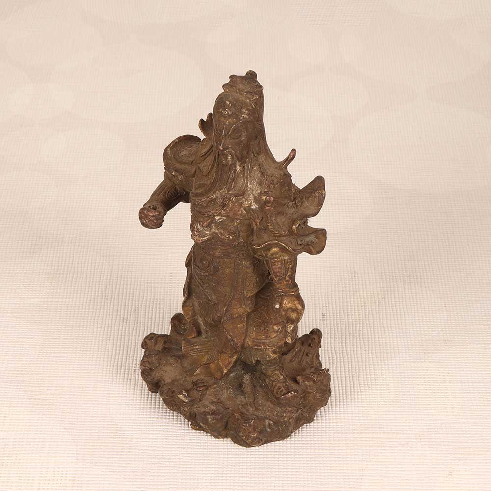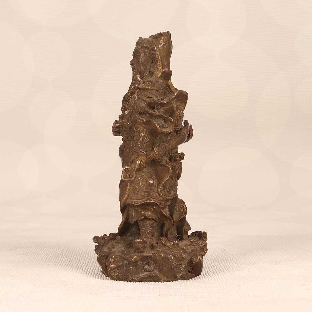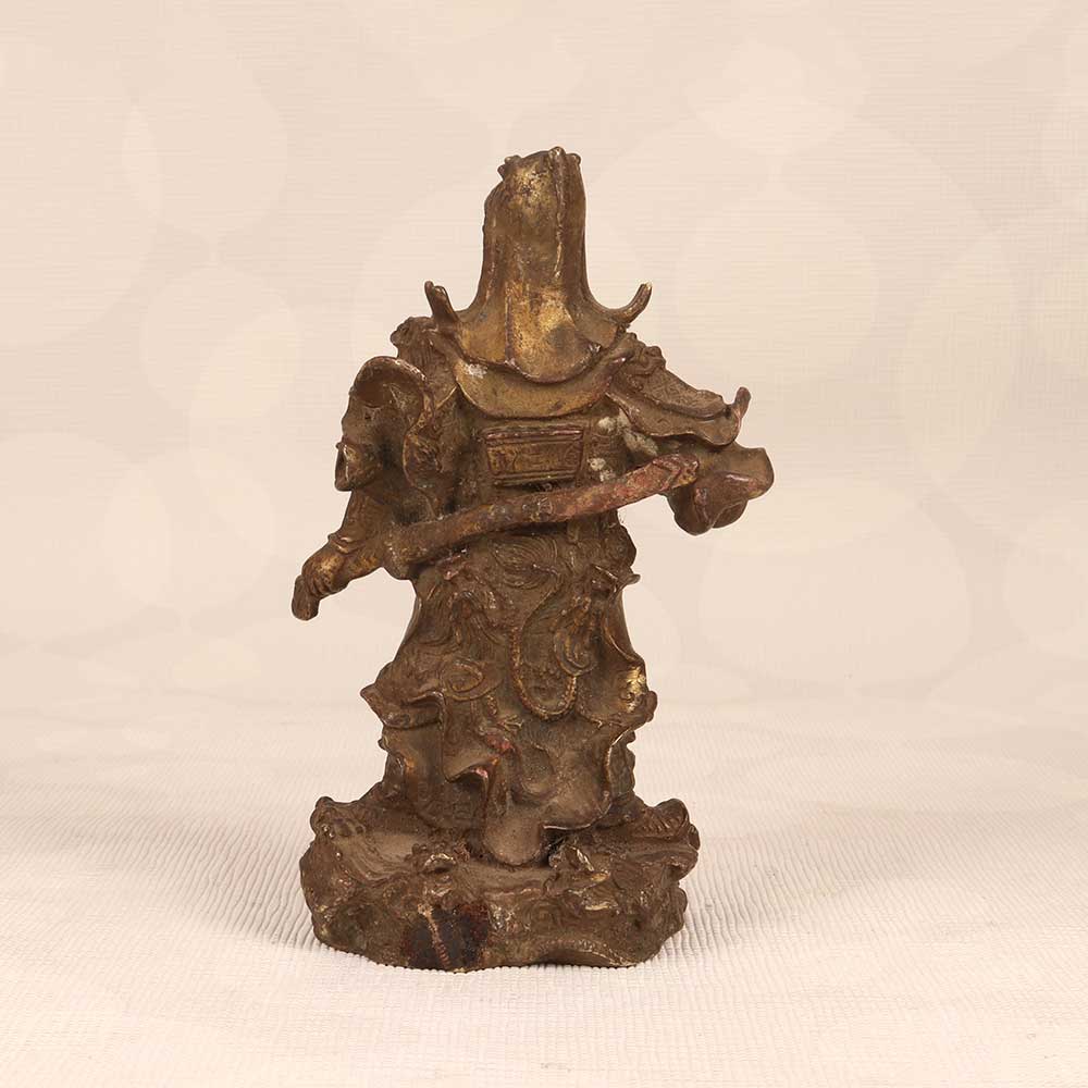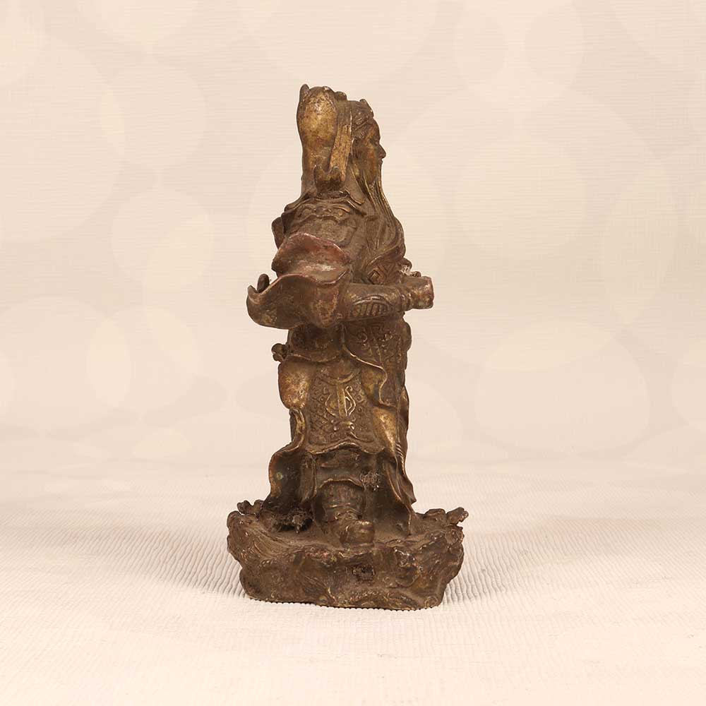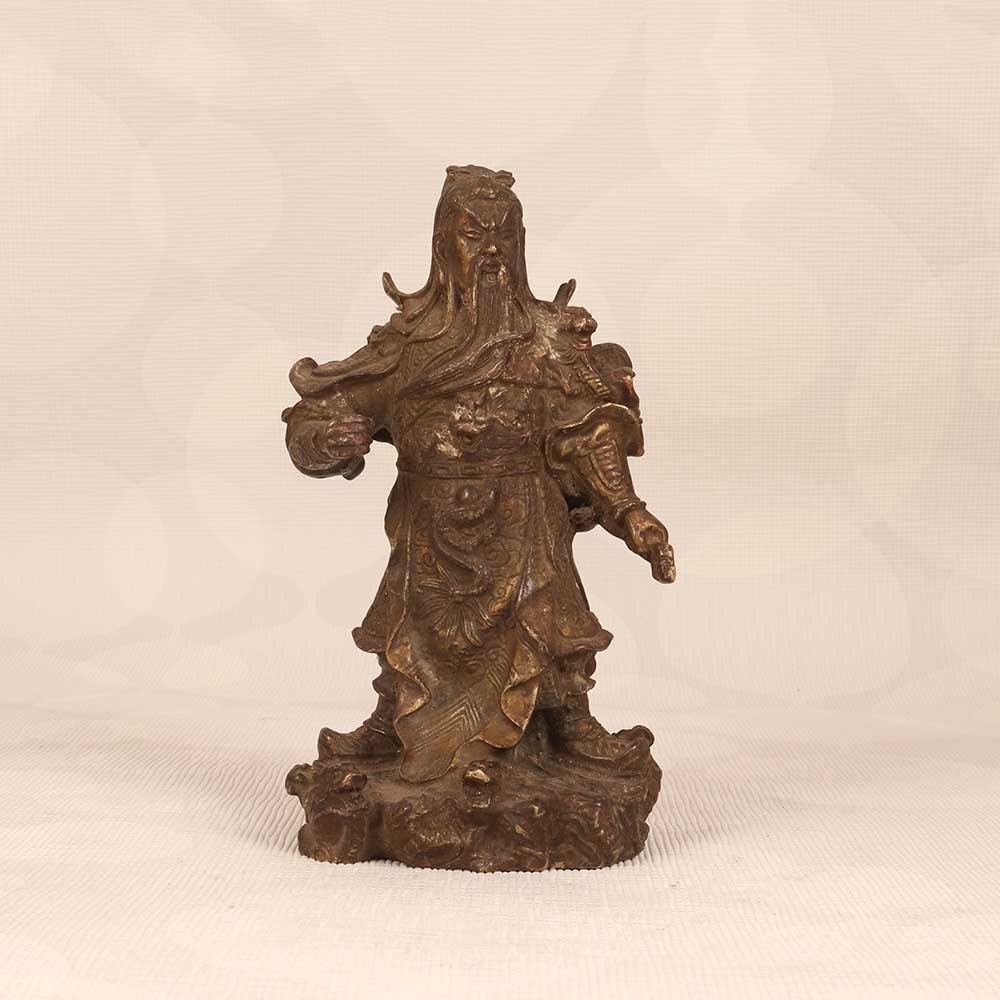 - Intricately cast vintage brass sculpture with fine details showcasing Guan Gong's armor, robes, and fierce expression