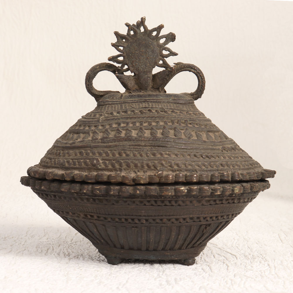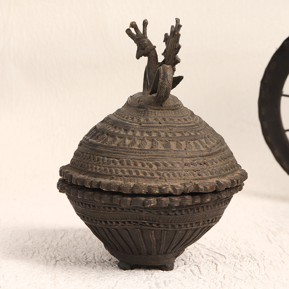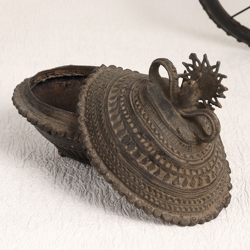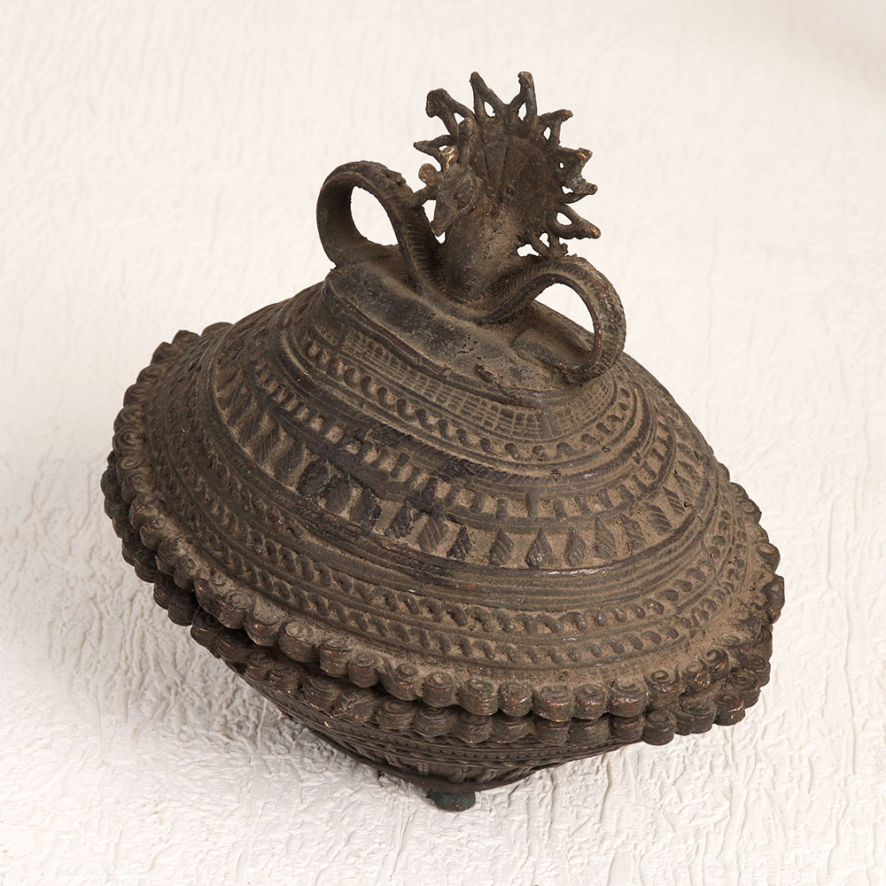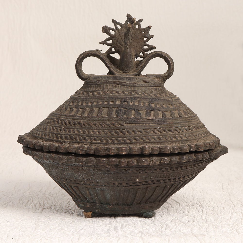 This Vintage Brass Prayer Kumkum Box in an oval shape is a masterpiece adorned with a finely carved peacock on its lid, showcasing impeccable Tribal Art craftsmanship. Crafted by professional artisans, this remarkable piece boasts a rich antique dark finish, exuding an aura of timeless elegance. Handmade with precision and care, using only the finest quality brass, this kumkum box serves a multitude of purposes. Whether gracing your home, office, restaurant, hotel, cafe, or shop, it serves as both a captivating decorative element and a symbol of spiritual devotion. It's more than just an accessory, it's a testament to craftsmanship, spirituality, and timeless beauty. This versatile artefact is not only a valuable addition to your vintage collection but can also steal the limelight at exhibitions and displays. Its unique charm makes it an ideal gift for your loved ones on special, festive, or auspicious occasions, symbolizing your appreciation for their spirituality and aesthetics.
