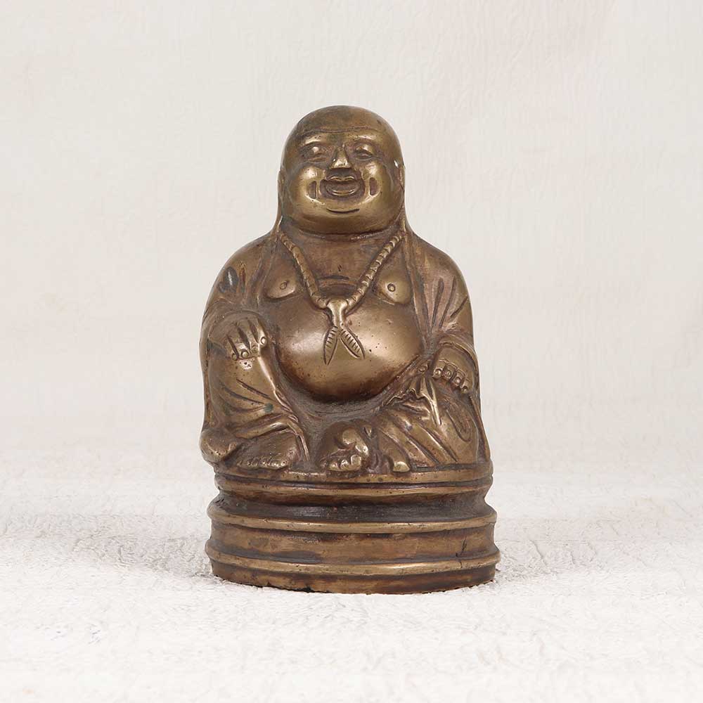 Bring good fortune and joy into your home with this stunning vintage brass Laughing Buddha. This finely crafted statue features the jovial figure in a relaxed pose, with his round belly and smiling face depicting happiness and inner peace. Laughing Buddha statues are highly symbolic in Chinese culture and Feng Shui, representing prosperity, wealth, and wisdom. The Laughing Buddha's big belly and wide grin epitomize a life of contentment and acceptance. His raised hand signifies divine protection and his bald head symbolizes confidence and enlightenment. This vintage brass Laughing Buddha is perfect for those looking to infuse their home with good luck and positive energy. Place it in your office, living room, or bedroom to invite fortune and blessings into your life.