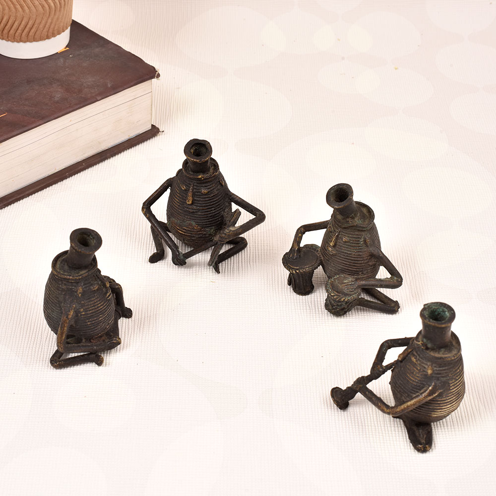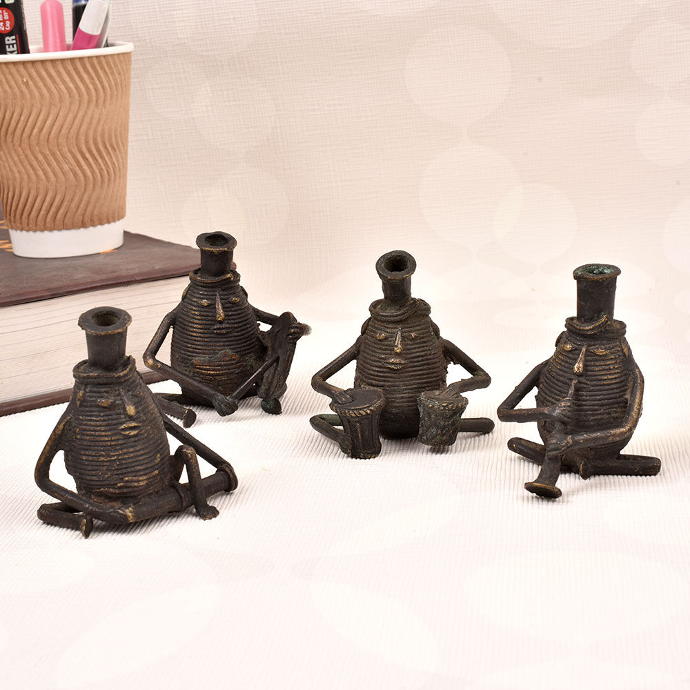Prepare to be captivated by the mesmerizing Brass Quartet - a stunning vintage brass statue that will transport you to a world of timeless artistry. Crafted in the captivating Dhokra Art tradition, this exquisite piece features four male figures, each masterfully sculpted and playing a different musical instrument. This stunning brass statue is more than just a decorative piece - it's a work of art that will elevate the ambiance of your home or office. Imagine its warm, metallic glow casting a mesmerizing light, while the lifelike figures seem to come alive with the melodies of a bygone era. Whether displayed on a mantel, bookshelf, or side table, the Brass Quartet will command attention and spark conversation. This captivating statue is perfect for music lovers, art enthusiasts, and anyone seeking to infuse their space with a sense of cultural richness and timeless beauty. Invest in a piece that will be cherished for generations, and let the Brass Quartet transport you to a world of enchantment every time you gaze upon it.