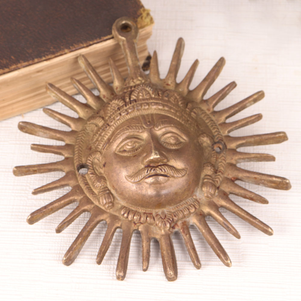 This Vintage Sun God Brass Plate is a masterpiece handcrafted by highly skilled Indian artisans in a rich antique brown finish. Crafted with precision and passion, this stunning piece is a testament to the artistry and craftsmanship of India's ancient traditions. The centerpiece of this magnificent brass plate is the resplendent Sun God, a symbol of power, vitality, and divinity in Hindu mythology. The Sun God, also known as Surya, is revered for bestowing light, energy, and life upon the world. Placing this plate in your home, office, restaurant, hotel, shop, or cafe's prayer room not only adds a touch of elegance but also invites positive energy and blessings into your space. Its versatile design makes it suitable for both decorative purposes and spiritual reverence. The Vintage Sun God Brass Plate is a timeless addition to your collection of vintage artefacts and can be proudly displayed at exhibitions, showcasing its rich heritage and aesthetic appeal. Moreover, this plate makes for a thoughtful and meaningful gift for your loved ones on special, festive, or auspicious occasions, conveying your best wishes and the warmth of tradition.