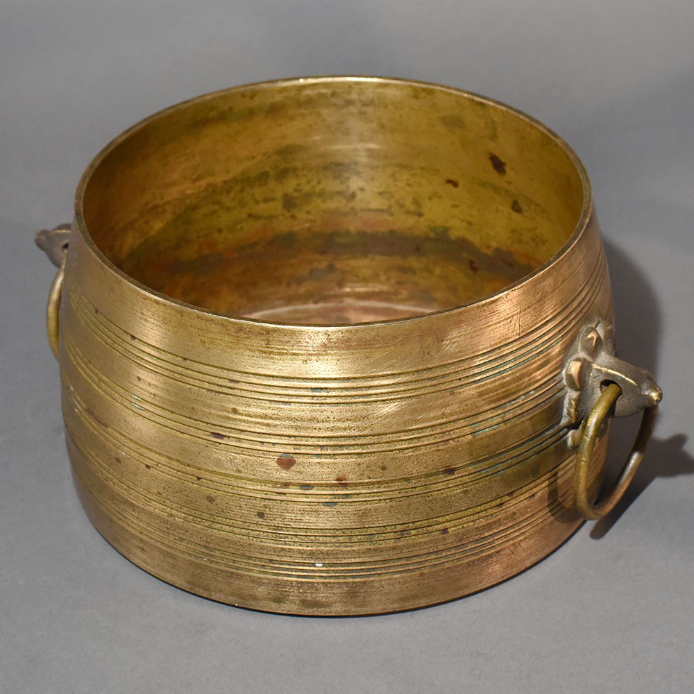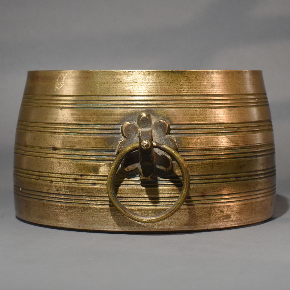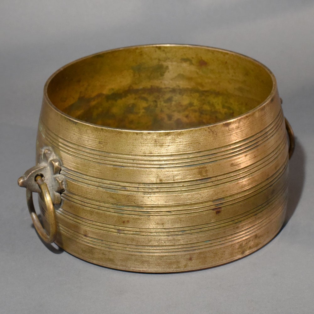 Crafted with timeless appeal, this handmade vintage brass ritual bowl reflects the enduring beauty of traditional metal craftsmanship. Designed in a classic cylindrical form, the bowl features finely etched horizontal grooves that add subtle texture and depth to its warm golden surface. The aged patina enhances its antique character, making it a striking addition to both traditional and contemporary interiors. This handcrafted brass bowl is fitted with sturdy side ring handles, allowing for easy handling while adding to its authentic old-world aesthetic. Whether used as a decorative accent, spiritual vessel, or collectible metalware piece, it brings heritage charm and artisanal authenticity into any space. The natural variations in tone and texture highlight the handmade process, ensuring that each piece carries its own unique identity. Perfect for placement in living rooms, entryways, pooja rooms, or curated vintage collections, this brass vessel effortlessly blends history with decor styling. Its solid metal construction ensures durability while preserving the elegance of traditional craftsmanship.