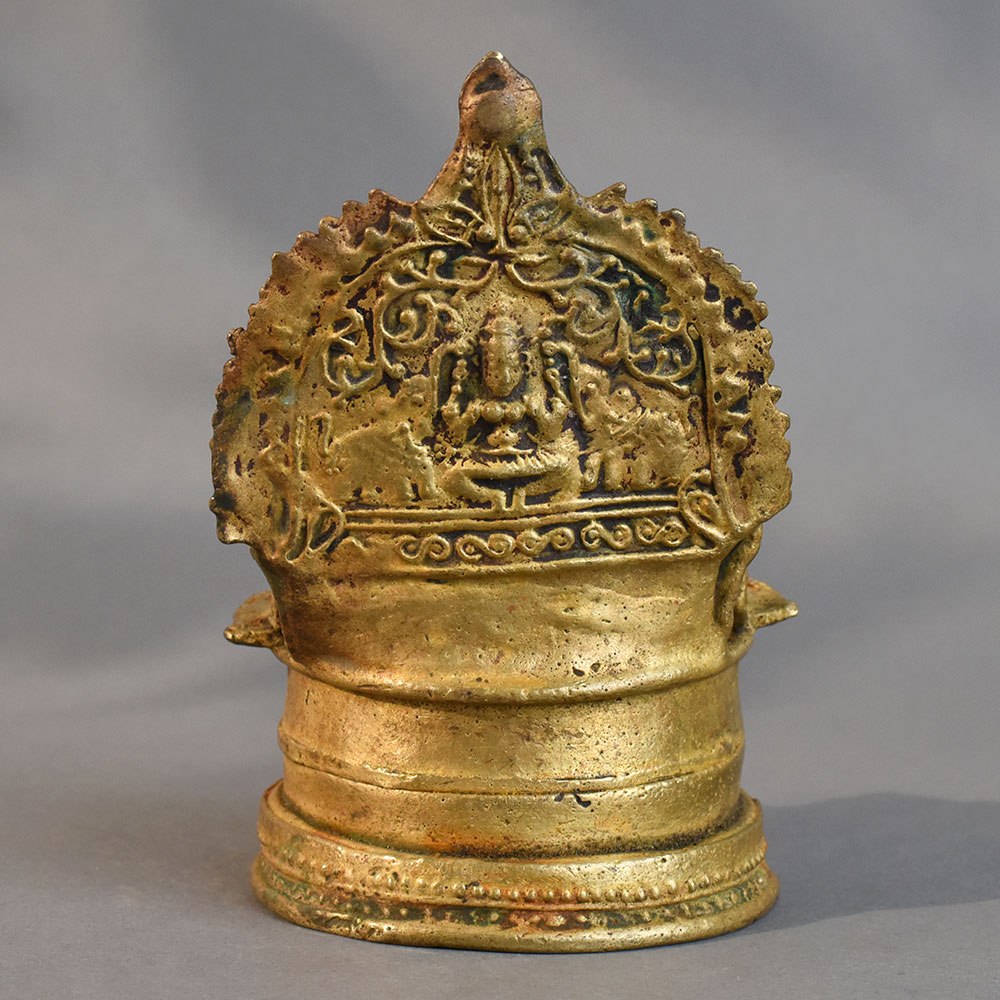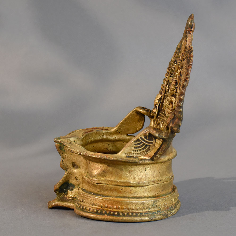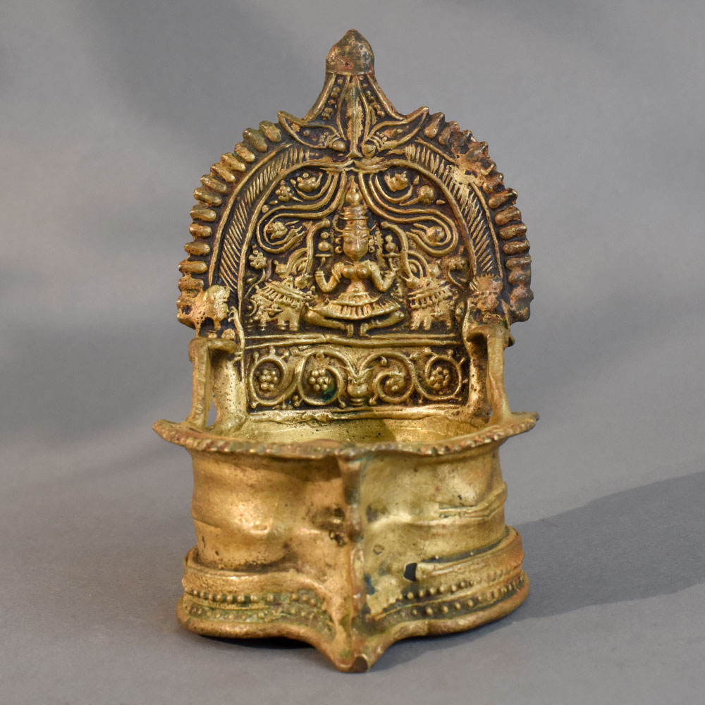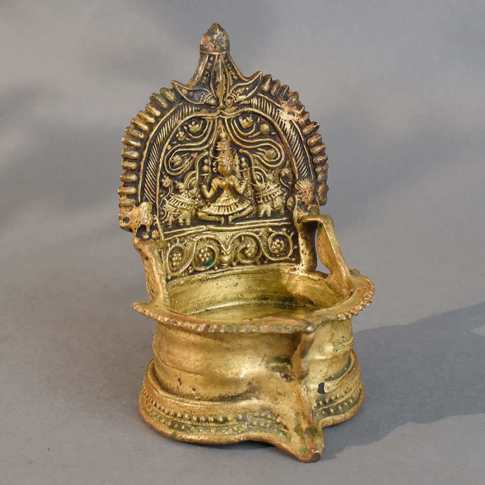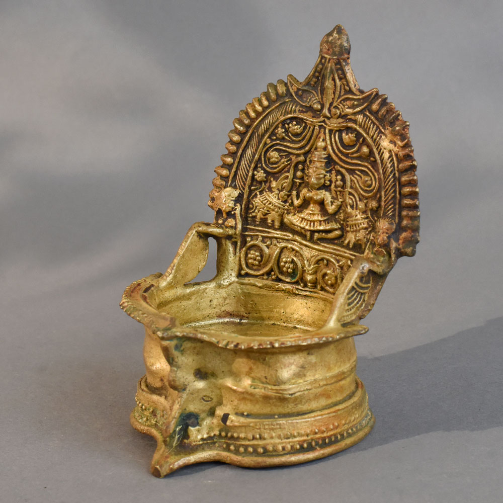 - Handmade vintage brass diya with intricate South Indian temple carvings