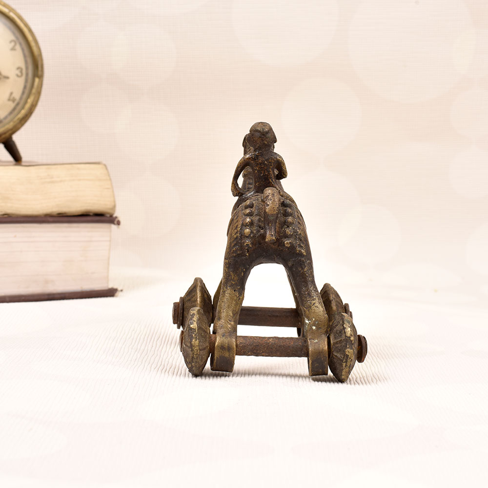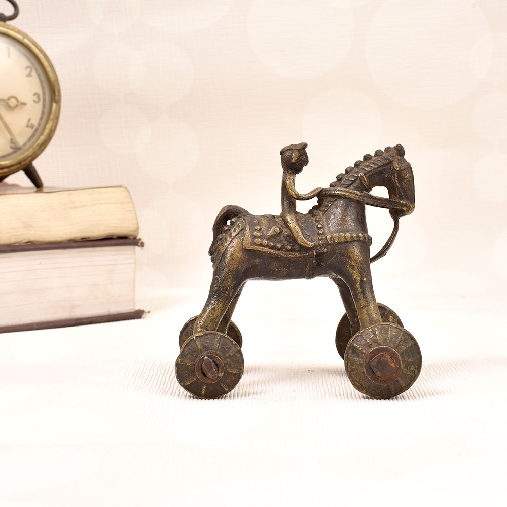 Commanding attention from the moment it enters a room, this stunning vintage brass statue of a horse with rider captures the regal splendor of Central India's artistic heritage. Crafted with meticulous detail, the life-size horse and rider stand proud atop four ornate wheels, ready to transport you to another era. This majestic brass statue is a testament to the rich cultural traditions of Central India. Display it in your entryway, living room, or office to infuse your space with the timeless elegance of the region's artistic mastery. Whether you're a collector of fine Indian antiques or simply seeking a striking conversation piece, this horse and rider statue will elevate your décor and ignite the imagination.