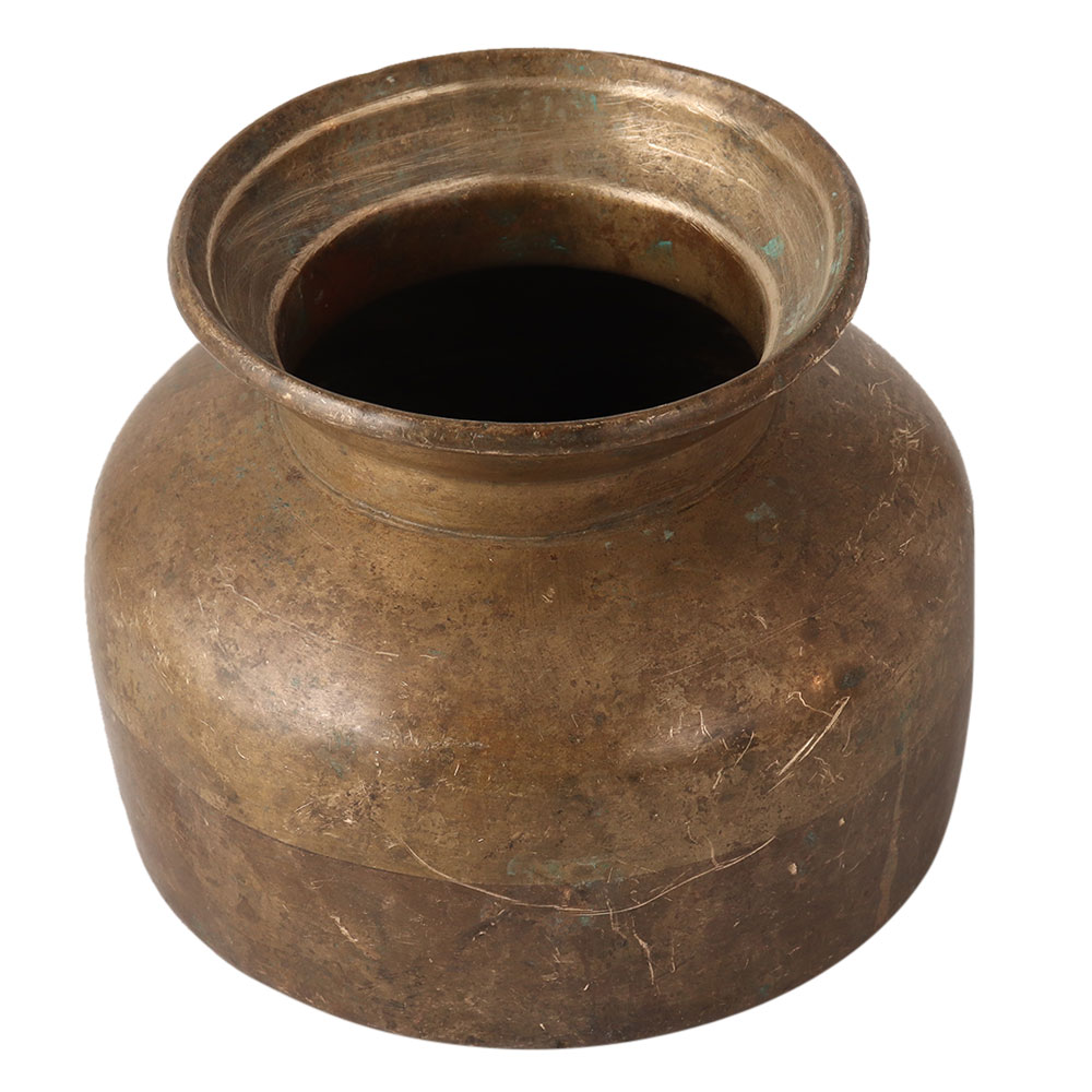Vintage handmade brass water pot for decoration, planting flowers or Hindu rituals. It was made by skilled crafstmen in India. It has a flat bottom to stay on the surface.