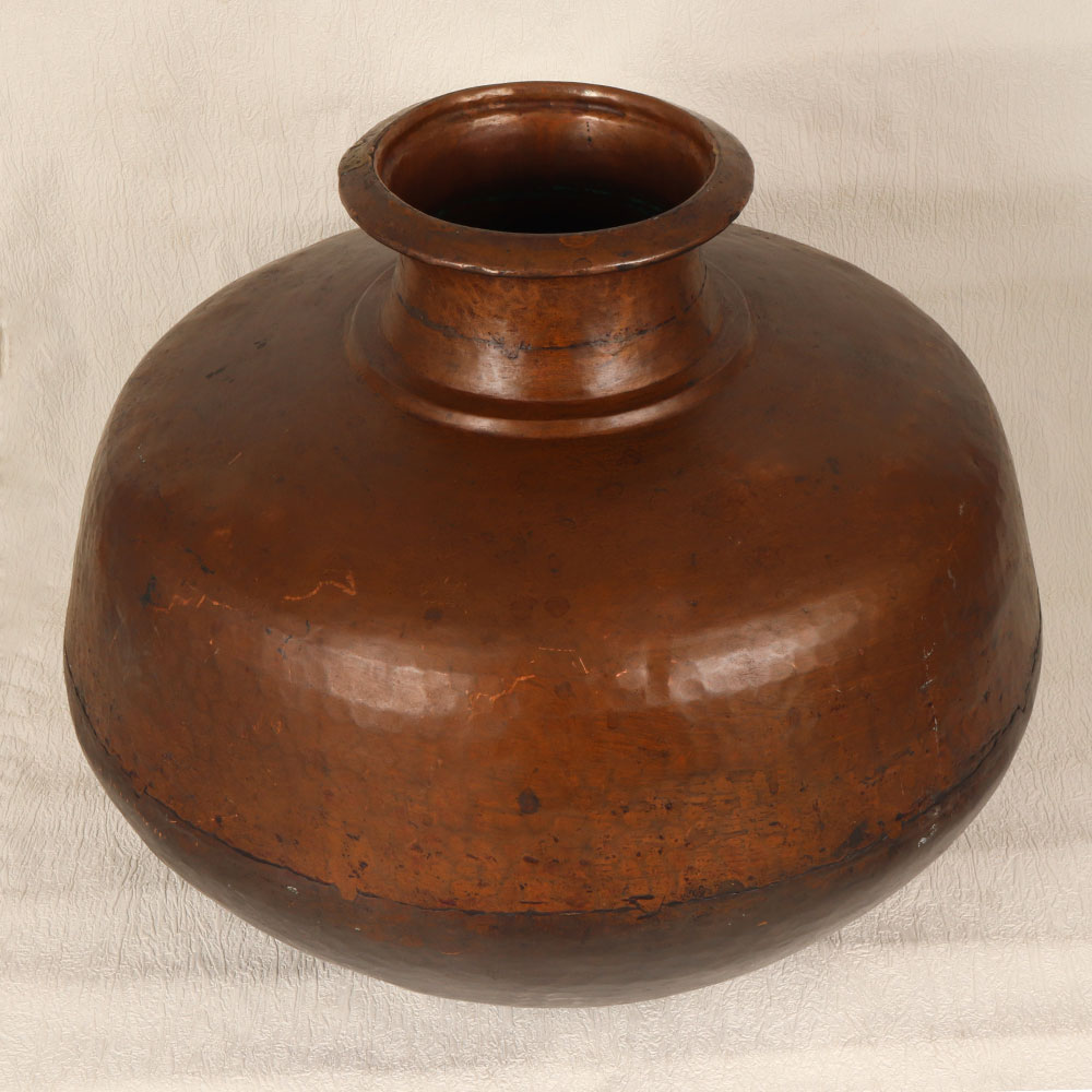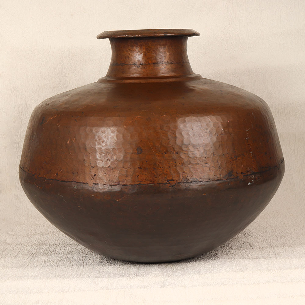 A Vintage Copper Water Pot with Nickel Plating which is a testament to the timeless beauty of Islamic Art crafted by highly talented Indian artisans. Handmade with precision and care, this unique piece showcases a small-mouthed design adorned with intricate hammered patterns, evoking the charm of a bygone era. Constructed from high-quality copper and elegantly plated with nickel, the pot exudes a lustrous antique brown finish, adding warmth and sophistication to any space. Its versatile design allows it to seamlessly integrate into various settings, making it a perfect addition to homes, offices, restaurants, hotels, or cafes. This multi-functional masterpiece serves as more than just a decor item; it doubles as an indoor flower pot, infusing nature's beauty into your surroundings. The pot's undeniable vintage appeal makes it a coveted item for collectors, while its cultural roots and meticulous craftsmanship make it an ideal gift for your loved ones on special, festive, or auspicious occasions.