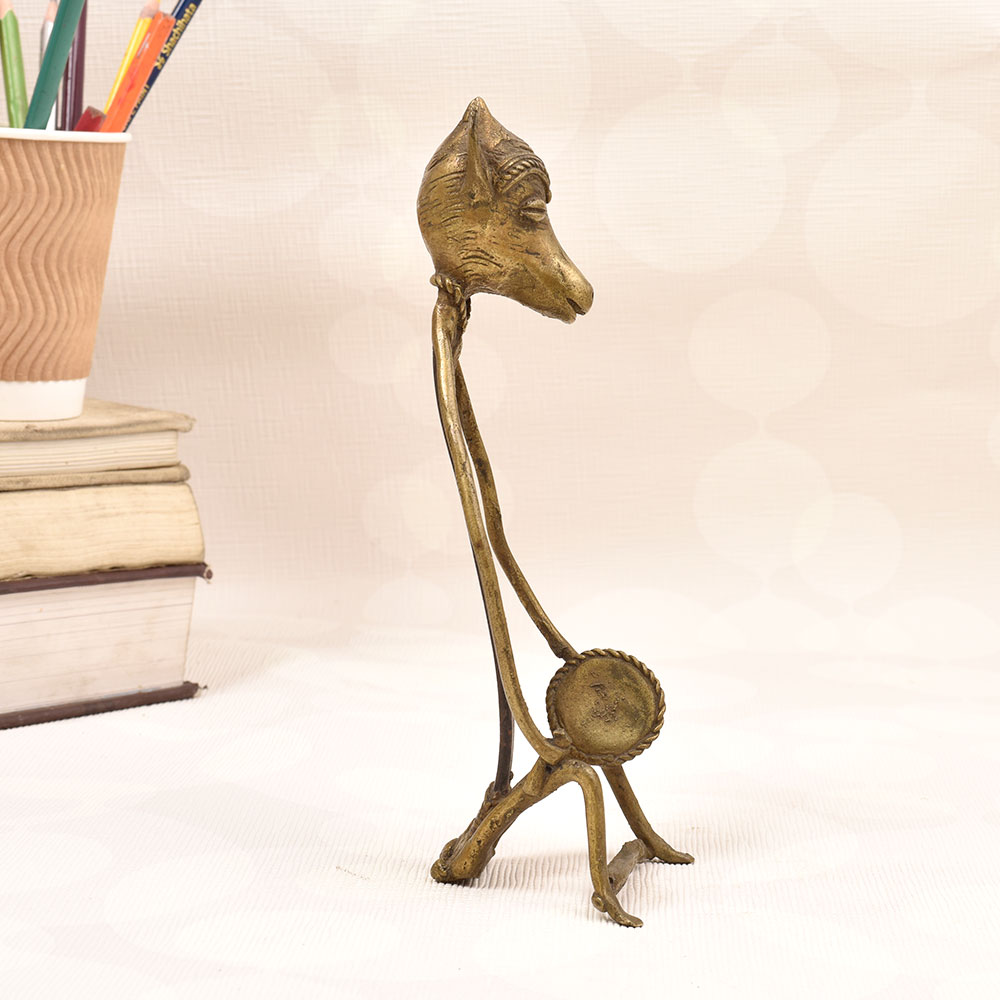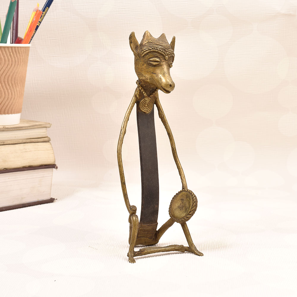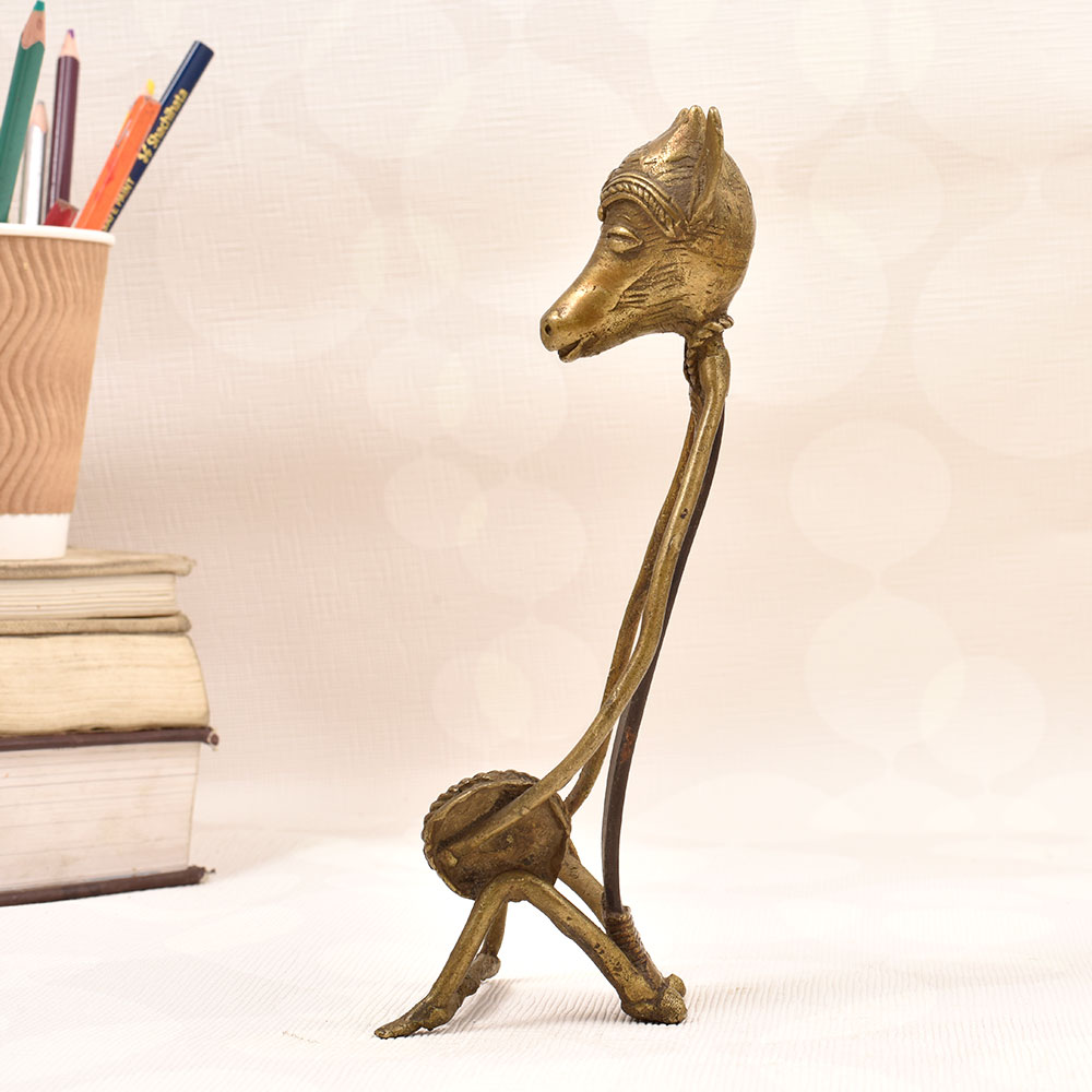Bring the captivating spirit of tribal culture into your home with this stunning folk brass and iron figure. Adorned with a majestic animal head, this one-of-a-kind piece commands attention and radiates an aura of mystique. This striking folk art figure is more than just a decorative accent - it's a portal into a rich, centuries-old tradition. The animal head symbolizes the deep connection between humans and the natural world, a reverence for the divine forces that shape our existence. Display this piece and let it ignite your imagination, transporting you to distant lands and ancient civilizations. Whether you're a collector of tribal art or simply seeking to infuse your home with cultural vibrancy, this folk brass and iron figure is a must-have. Its captivating presence will elevate your decor while sparking conversations and wonder among your guests. Embrace the allure of the exotic and let this extraordinary piece become the centerpiece of your space.