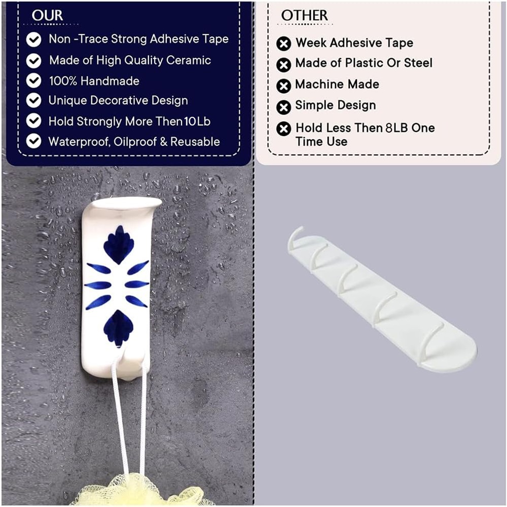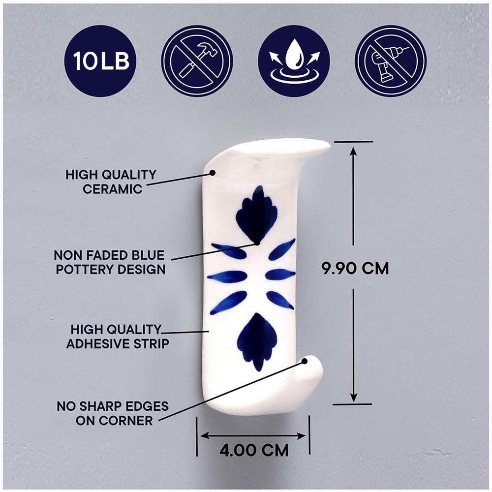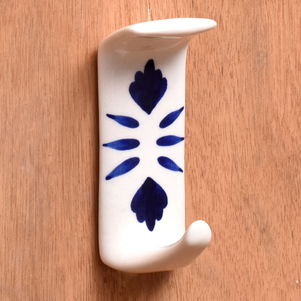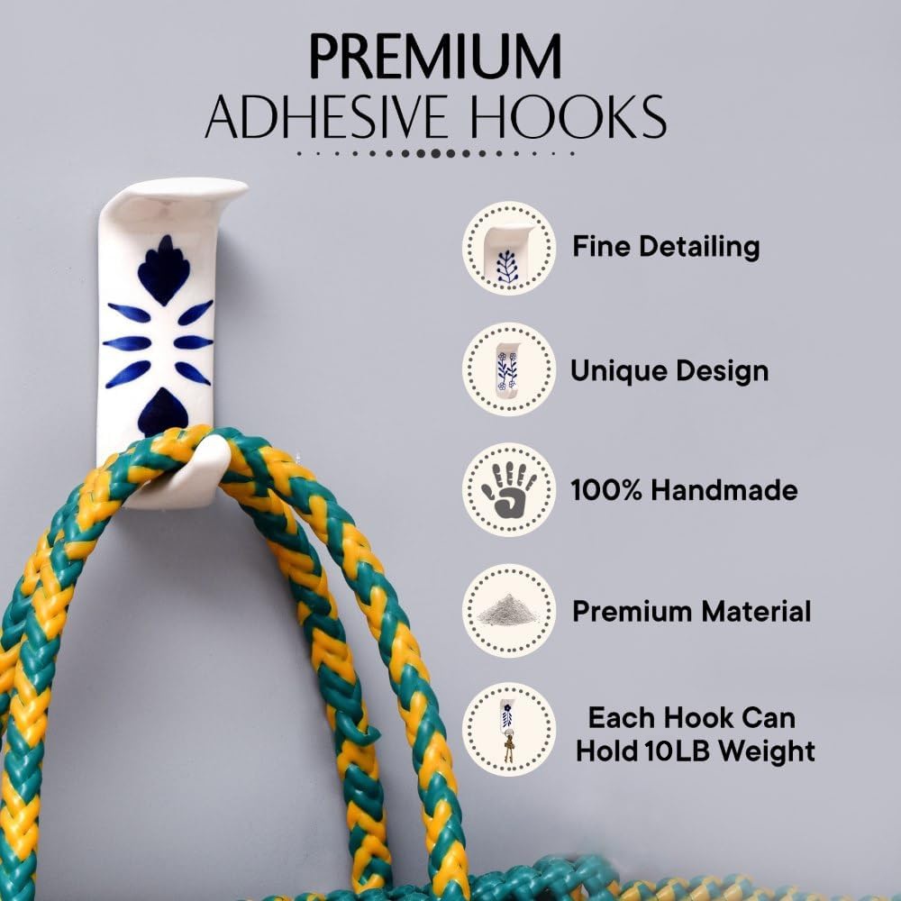 Indianshelf.com for bulk/wholesale orders.Indianshelf.us for personal purchases.The Handmade White Ceramic Blue Floral Adhesive Hook showcases a stunning ceramic base adorned with a delicate blue floral pattern, bringing a touch of elegance and charm to any environment. The soft white backdrop beautifully contrasts with the intricate blue floral designs, making it a perfect accessory for both contemporary and traditional home styles. This adhesive hook is ideal for organizing and enhancing your space without the hassle of drilling.