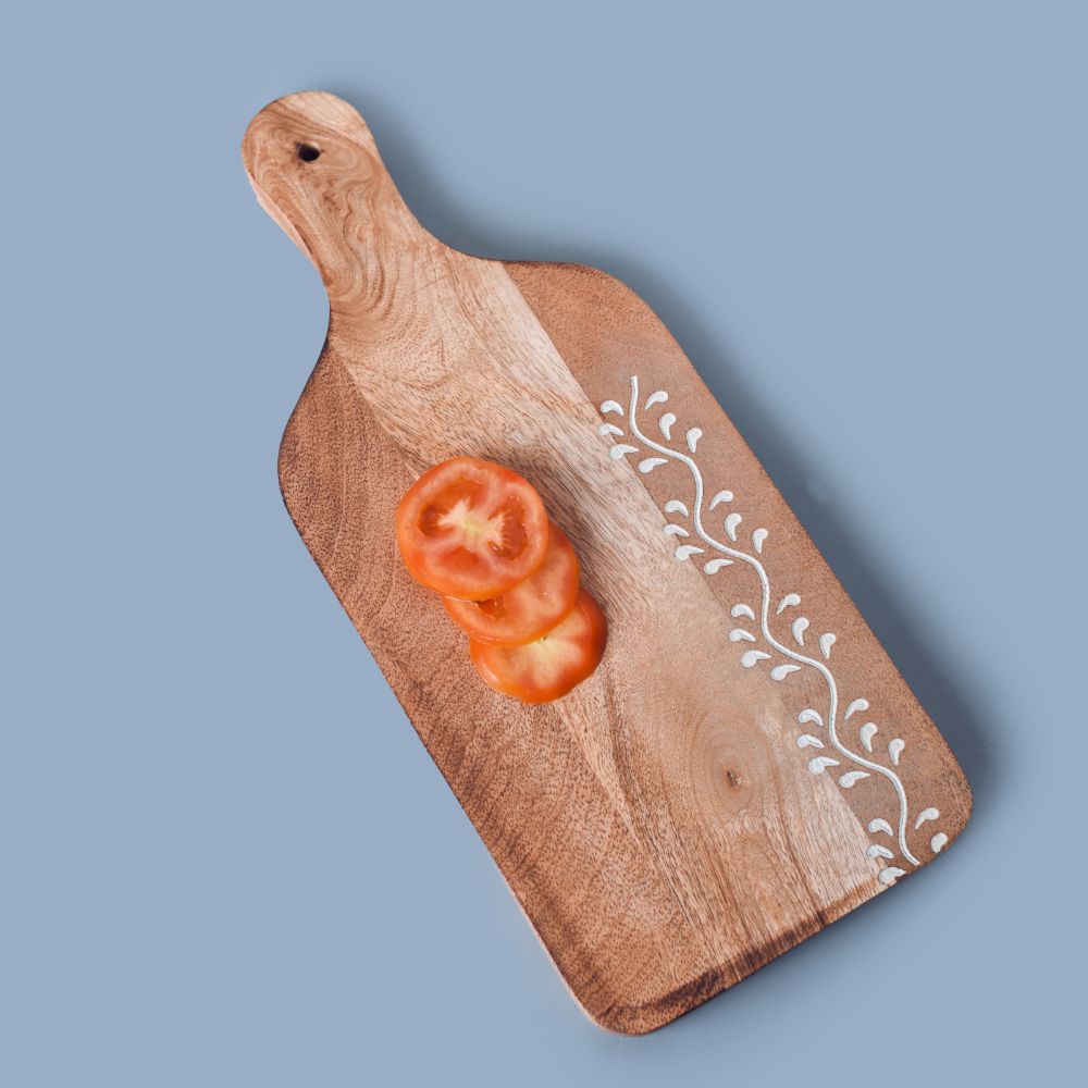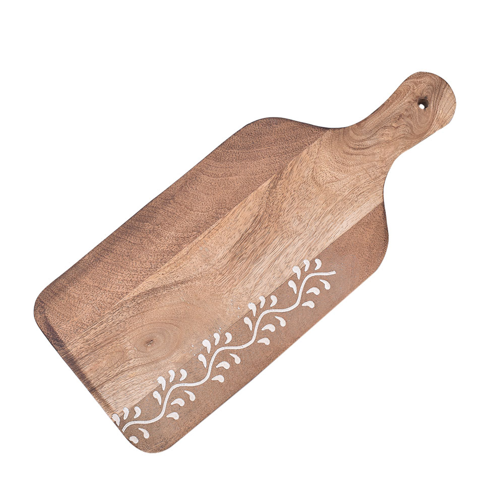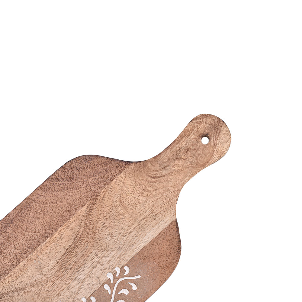 A wood cutting board with a hanging hole is a practical and convenient kitchen tool that can help you save space while keeping your cutting board within easy reach. These boards are made of high-quality wood, such as maple, cherry, or walnut, and are designed to withstand the rigours of everyday use. The hanging hole allows you to easily store the board on a hook or peg. This saves valuable countertop space and keeps the board off the surface, preventing moisture buildup and extending its lifespan. The board's surface is smooth and flat, providing a sturdy and reliable surface for food preparation. The natural wood grain adds a touch of beauty to the board and makes it a stylish addition to any kitchen. Wooden cutting boards are also known for their natural antibacterial properties, making them a hygienic choice for food preparation. They are gentle on knife blades, preventing them from quickly becoming dull. To maintain the quality and longevity of your wood cutting board with a hanging hole, cleaning it thoroughly after each use is essential. Simply wash it with warm soapy water, dry it completely, and oil it regularly to prevent it from drying out and cracking. Overall, a wood cutting board with a hanging hole is a versatile and practical kitchen tool that will make food preparation more accessible and convenient. It is a space-saving solution that combines functionality and style, making it a valuable addition to any kitchen.