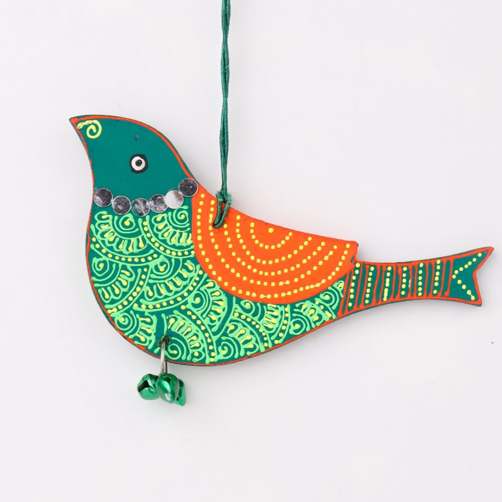 - Hand-painted wooden bird Christmas hanging with mirrors and bell accents