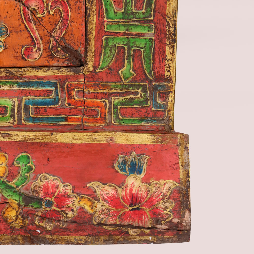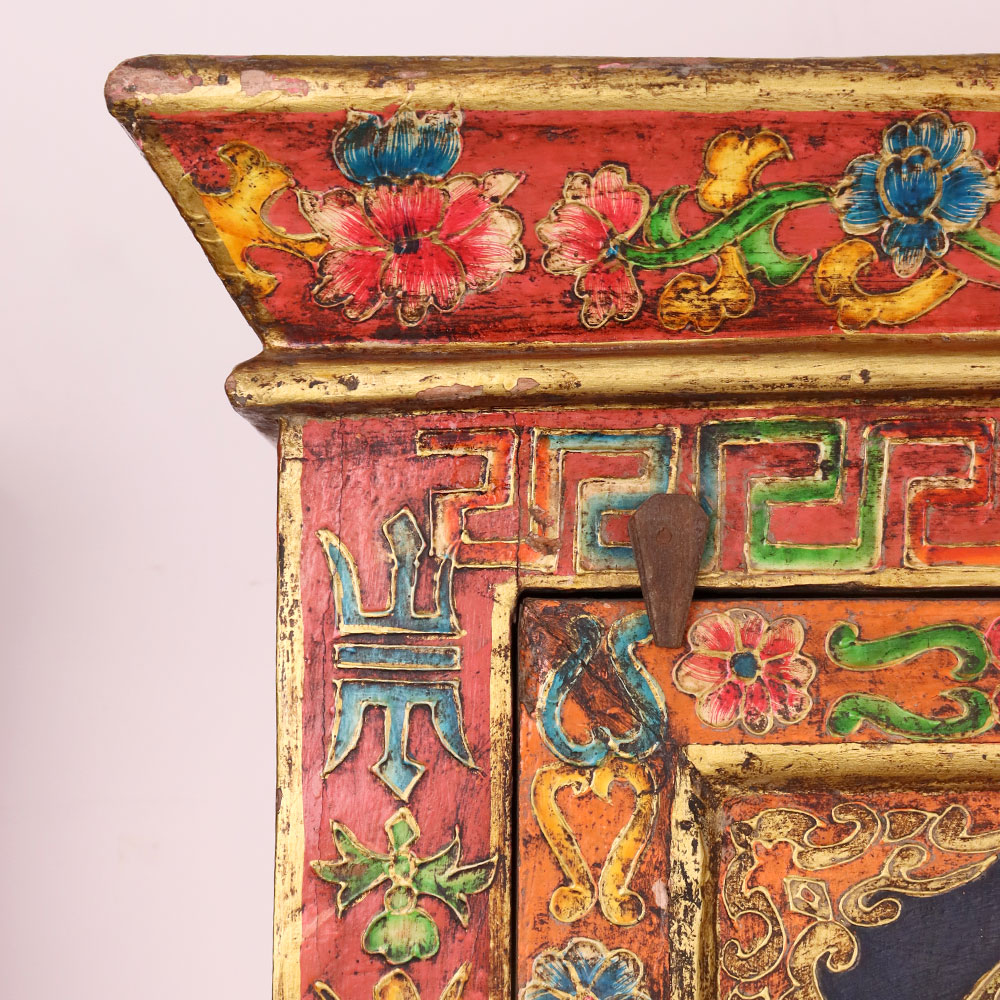 Celebrate the elegance of traditional artistry with this handmade wooden box, featuring two intricately hand-painted deity panels framed by vibrant floral and geometric borders. Crafted from durable wood, this antique-style cabinet showcases rich tones of red, green, and gold, with delicate floral carvings and symbolic patterns that highlight its cultural depth. Each deity painting symbolizes peace, wisdom, and protection, making this box a meaningful addition to meditation spaces, heritage interiors, or sacred altars. The spacious interior is ideal for storing jewelry, books, keepsakes, or spiritual objects while doubling as a striking statement décor piece. Its distressed finish enhances the authentic vintage appeal, ensuring no two pieces are alike. A perfect blend of function and heritage, this box is both collectible and practical.