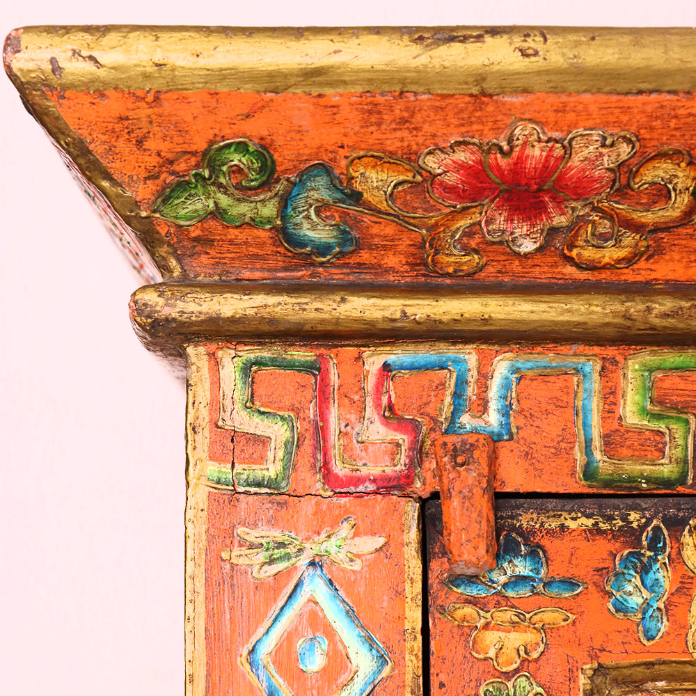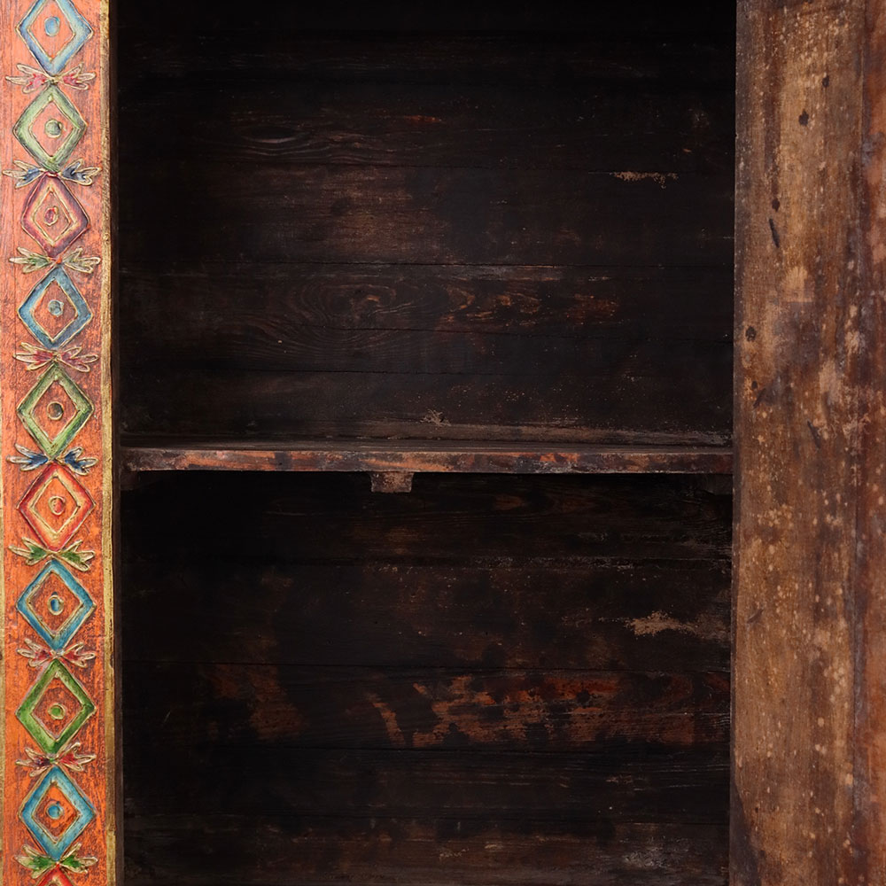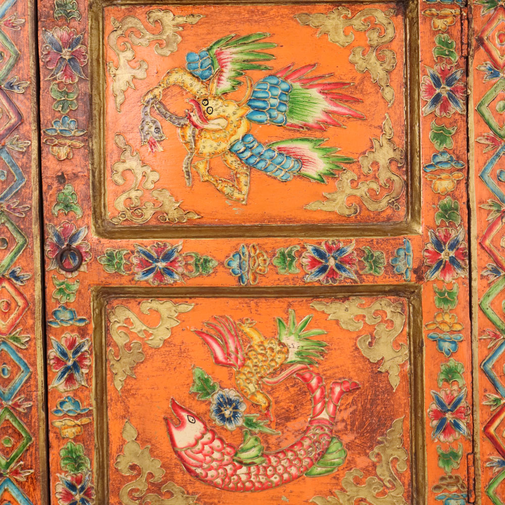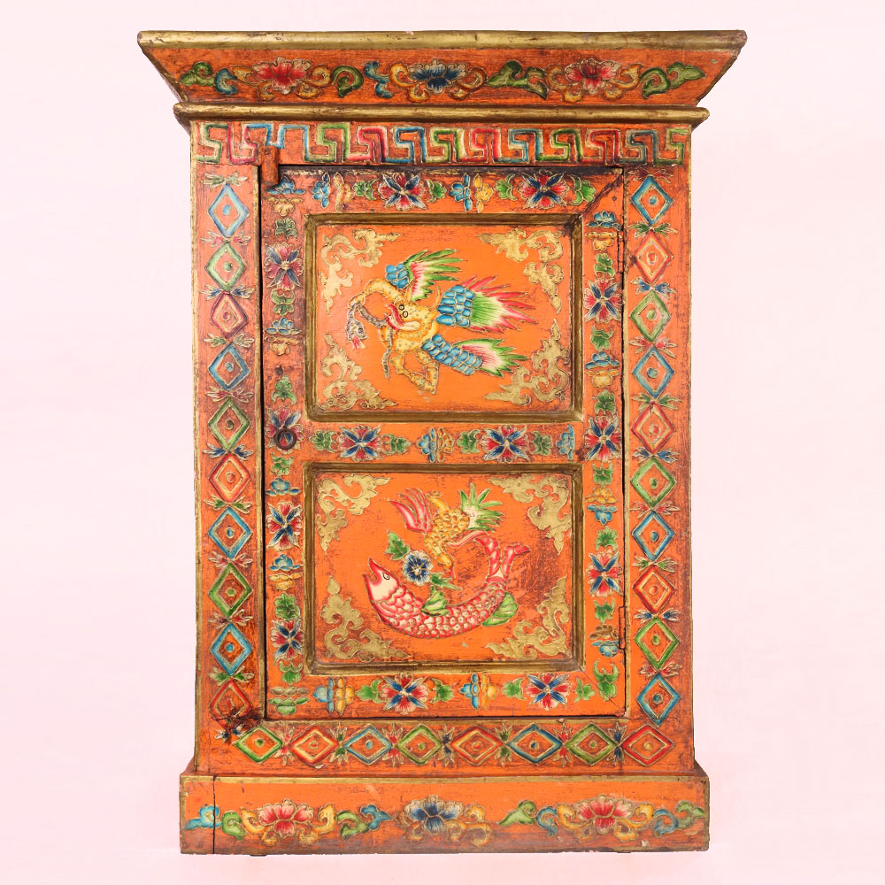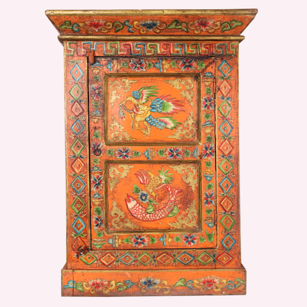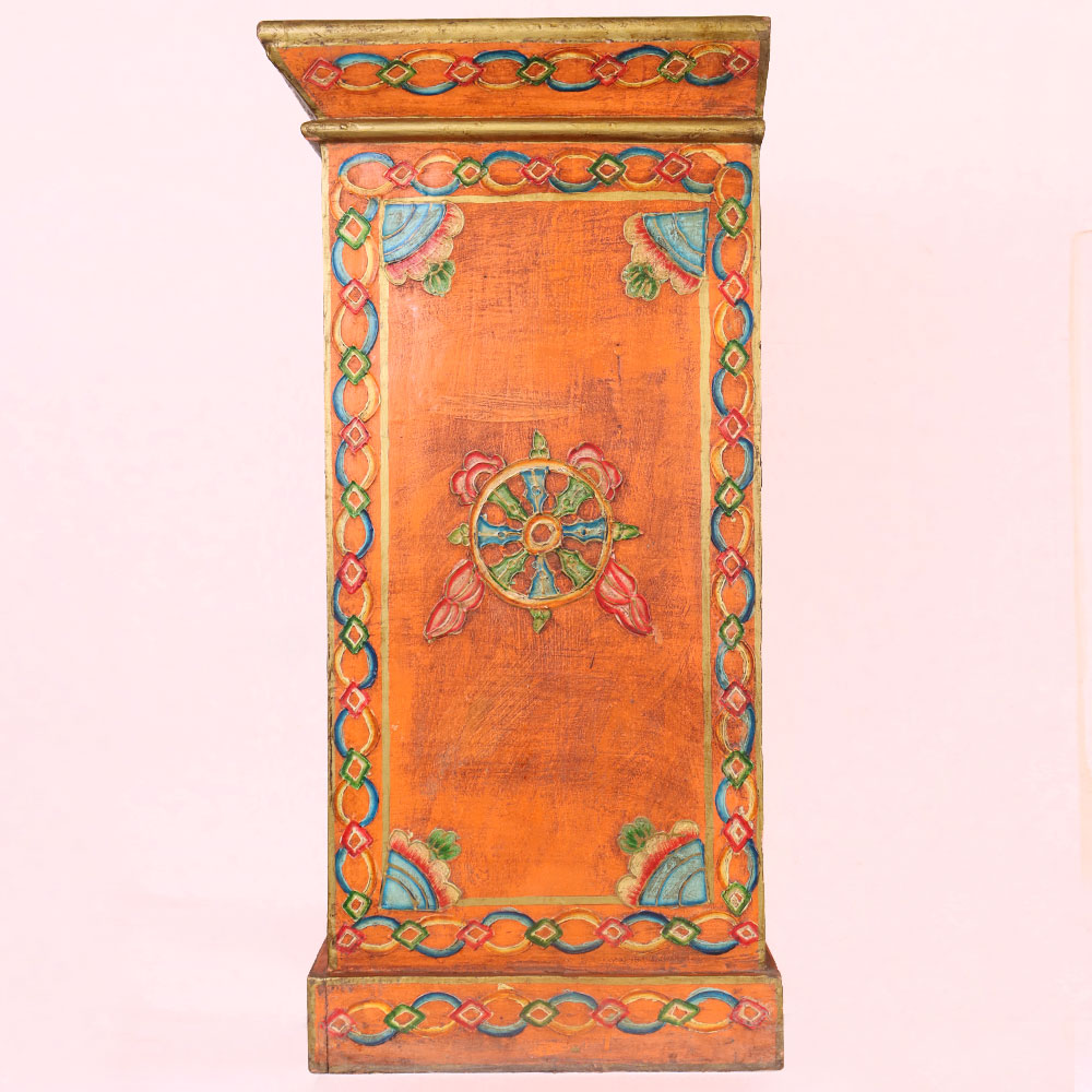 Enhance your interiors with this handmade wooden box, exquisitely decorated with vibrant hand-painted bird and fish motifs. Showcasing a striking orange base, framed with detailed floral and geometric carvings, this vintage storage cabinet reflects traditional craftsmanship and artistic finesse. Each panel is carefully painted by skilled artisans, bringing to life symbolic designs that represent prosperity, harmony, and cultural richness. The spacious interior features a sturdy shelf, making it ideal for storing jewelry, keepsakes, books, or sacred objects. Its antique finish and intricate patterns give it an authentic vintage charm, perfect for adding character to meditation rooms, heritage-inspired spaces, or eclectic home décor. A timeless blend of functionality and artistry, this handcrafted box is also a thoughtful gift for collectors and art lovers.