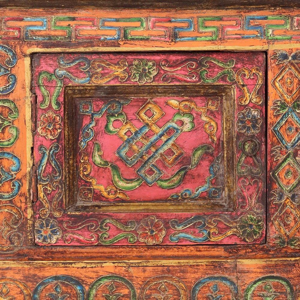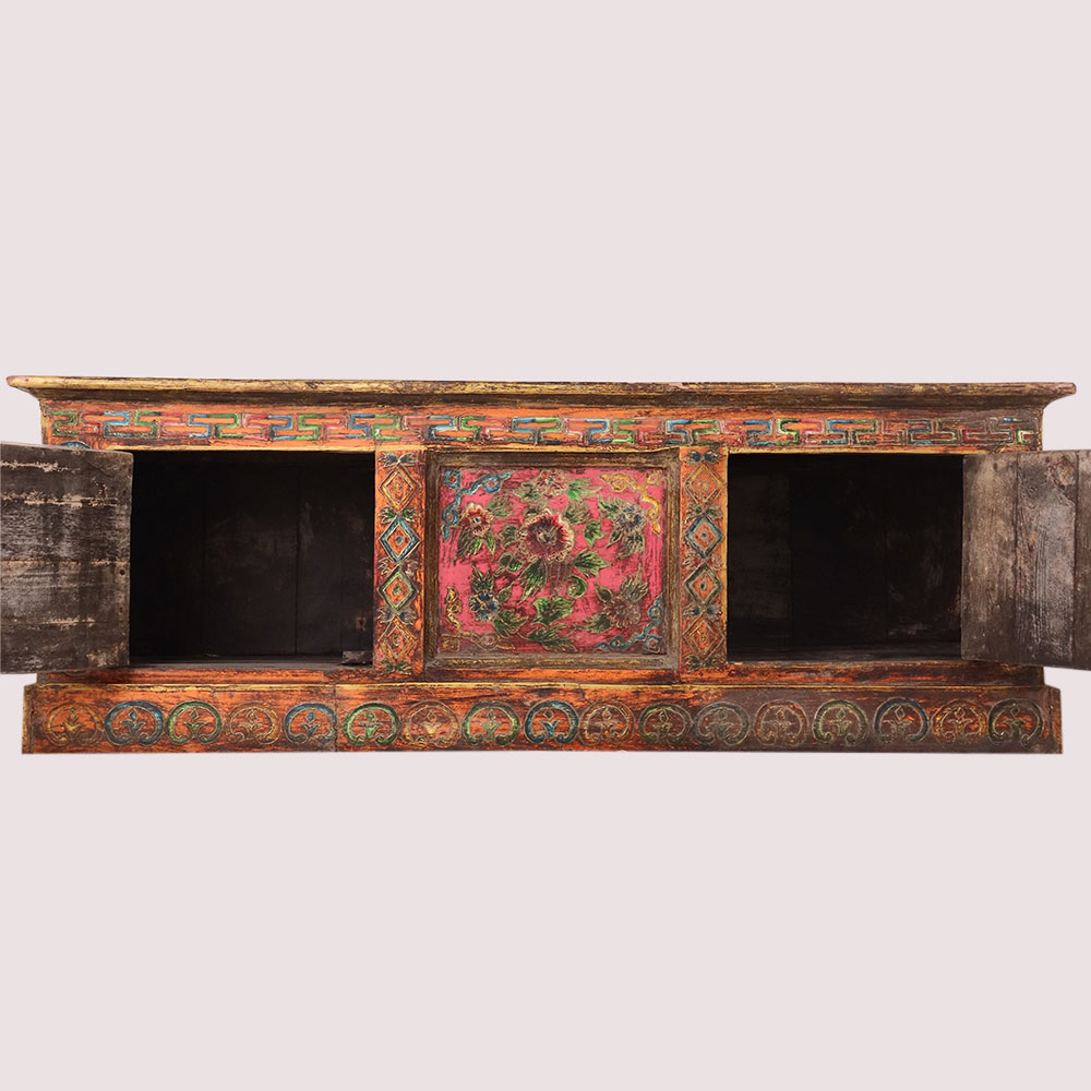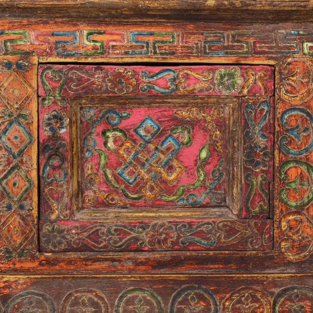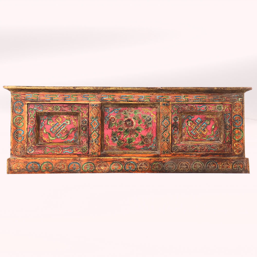 This handmade wooden storage box is a fine example of traditional craftsmanship, featuring hand-painted floral and geometric motifs in vibrant shades of pink, green, and gold. The intricate artwork showcases detailed borders and symbolic patterns, reflecting Tibetan-inspired artistry with an antique touch. Its wide structure makes it both functional and decorative, suitable for storing jewelry, keepsakes, documents, or spiritual items. Each piece is carefully painted by skilled artisans, making it a unique collectible that blends cultural symbolism with everyday practicality. With its antique finish and striking color palette, this wooden painted box enhances home décor with elegance and heritage charm. Perfect as a meaningful gift or as a centerpiece for your living room or meditation space.