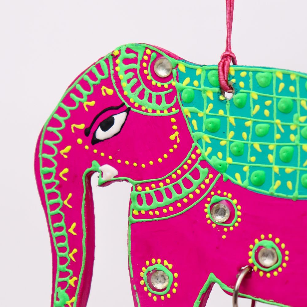 - Hand-painted wooden elephant wall hanging with mirrors and bell accents