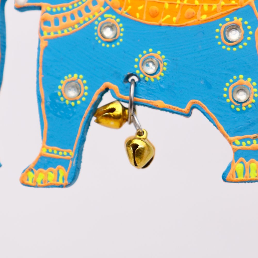 Bring a touch of traditional charm and artistic elegance to your walls with this Handmade Wooden Elephant Wall Hanging, beautifully crafted and hand-painted to brighten up your home decor. Symbolizing wisdom, strength, and prosperity, each elephant is decorated with vibrant colors, mirror accents, and a small bell that creates a gentle, soothing chime. Perfect for living rooms, entryways, balconies, or festive setups, this wall hanging blends cultural artistry with contemporary appeal. Available in four striking colors - Blue-Green, Red-Yellow, Sky Blue-Orange, and Pink-Green - you can purchase them individually or as a complete set of 4 for a coordinated, colorful display. These artisan-made wall hangings also make wonderful gifts for housewarmings, weddings, and festive occasions.