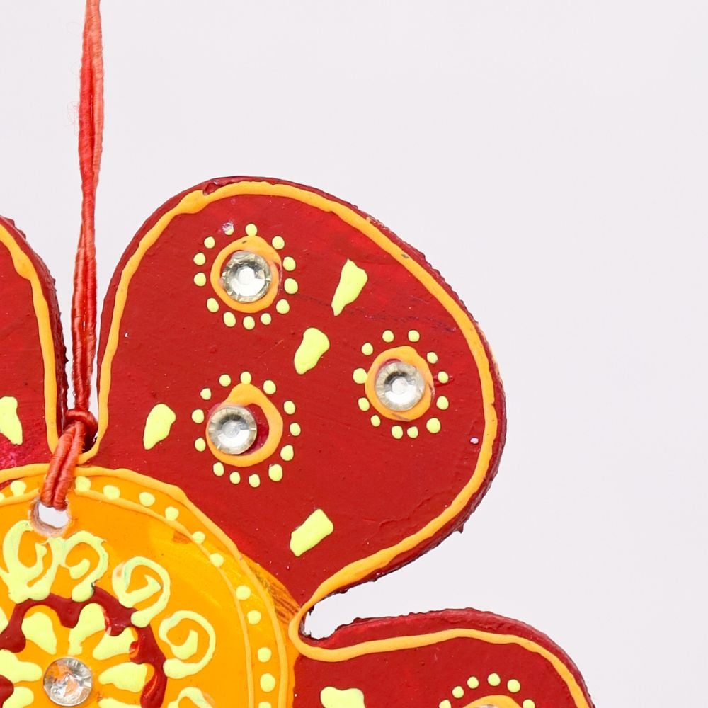 Bring a splash of festive color and artistry to your interiors with this Handmade Wooden Flower Christmas Hanging. Beautifully hand-painted with vibrant shades and intricate detailing, each piece is adorned with mirror accents and a tiny hanging bell that adds a cheerful touch. The flower design with five petals makes it a versatile decor accent, perfect for brightening up living rooms, balconies, kids’ rooms, and entryways. Available in four striking colors - Red-Yellow, Green-Pink, Blue-Green, and Sky Blue-Orange - you can select individual pieces or get the complete set of 4 for a coordinated, decorative display. These artisan-crafted Christmas hangings also make thoughtful gifts for housewarmings, festive occasions, or cultural celebrations.