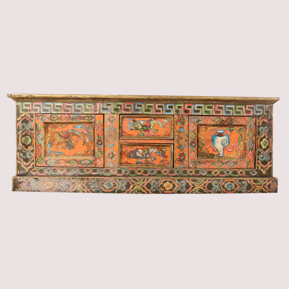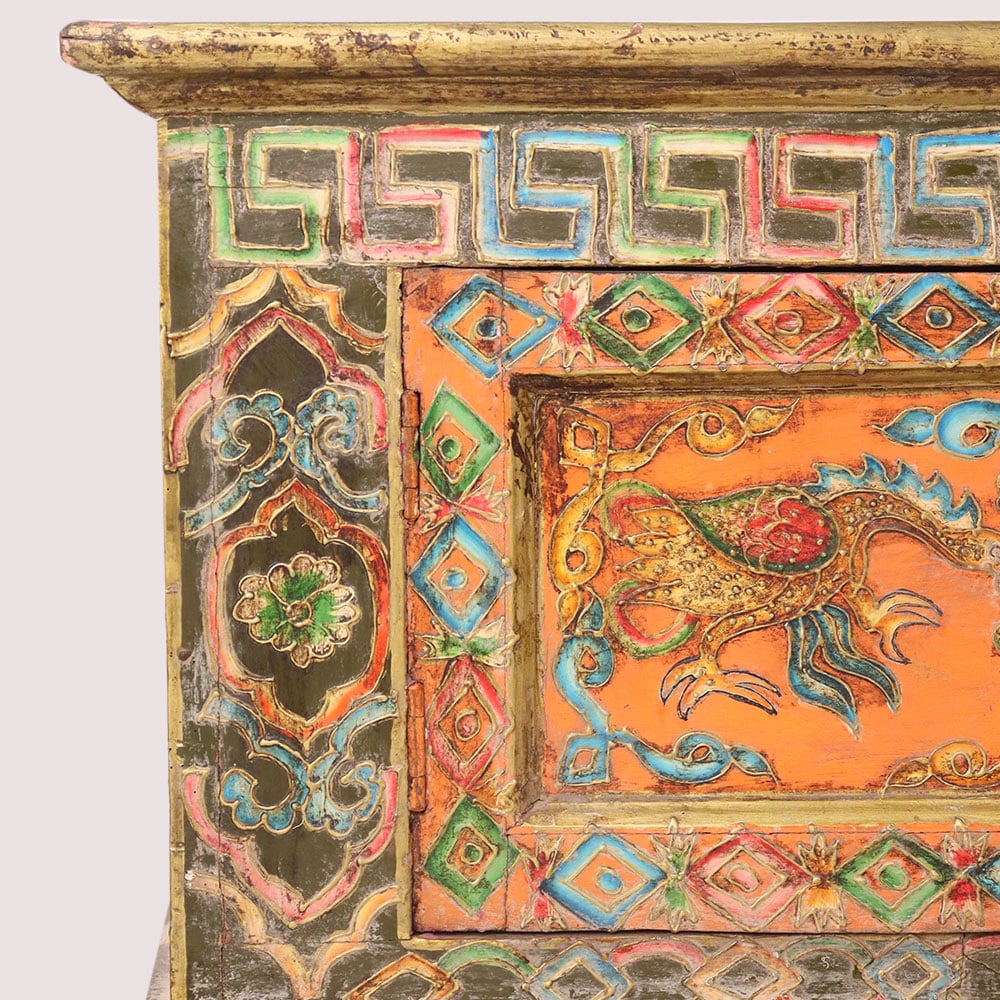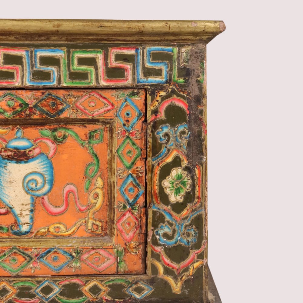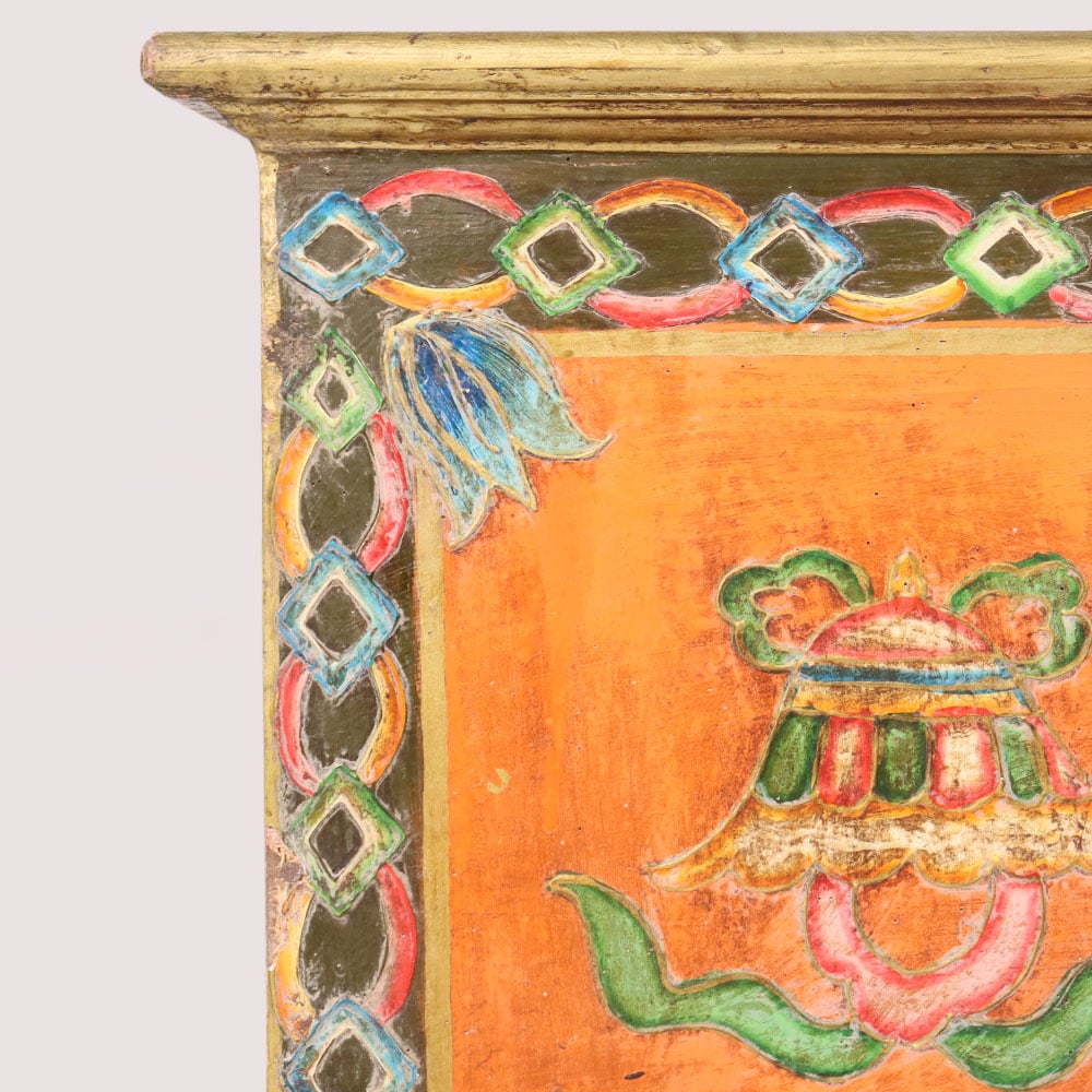 This handmade wooden storage box is a stunning piece of traditional craftsmanship, beautifully decorated with vibrant hand-painted motifs. Featuring symbolic designs such as mythical animals, floral borders, and geometric patterns, the box reflects the artistry and cultural richness of Tibetan and Himalayan traditions. The antique-style finish enhances its timeless appeal, making it both a functional storage solution and a decorative collectible. Ideal for use as a jewelry box, keepsake chest, or spiritual storage cabinet, this piece is crafted by skilled artisans who have preserved centuries-old painting techniques. Perfect for adding cultural elegance to your home décor or gifting to art lovers and collectors, this box blends practicality with artistic heritage.