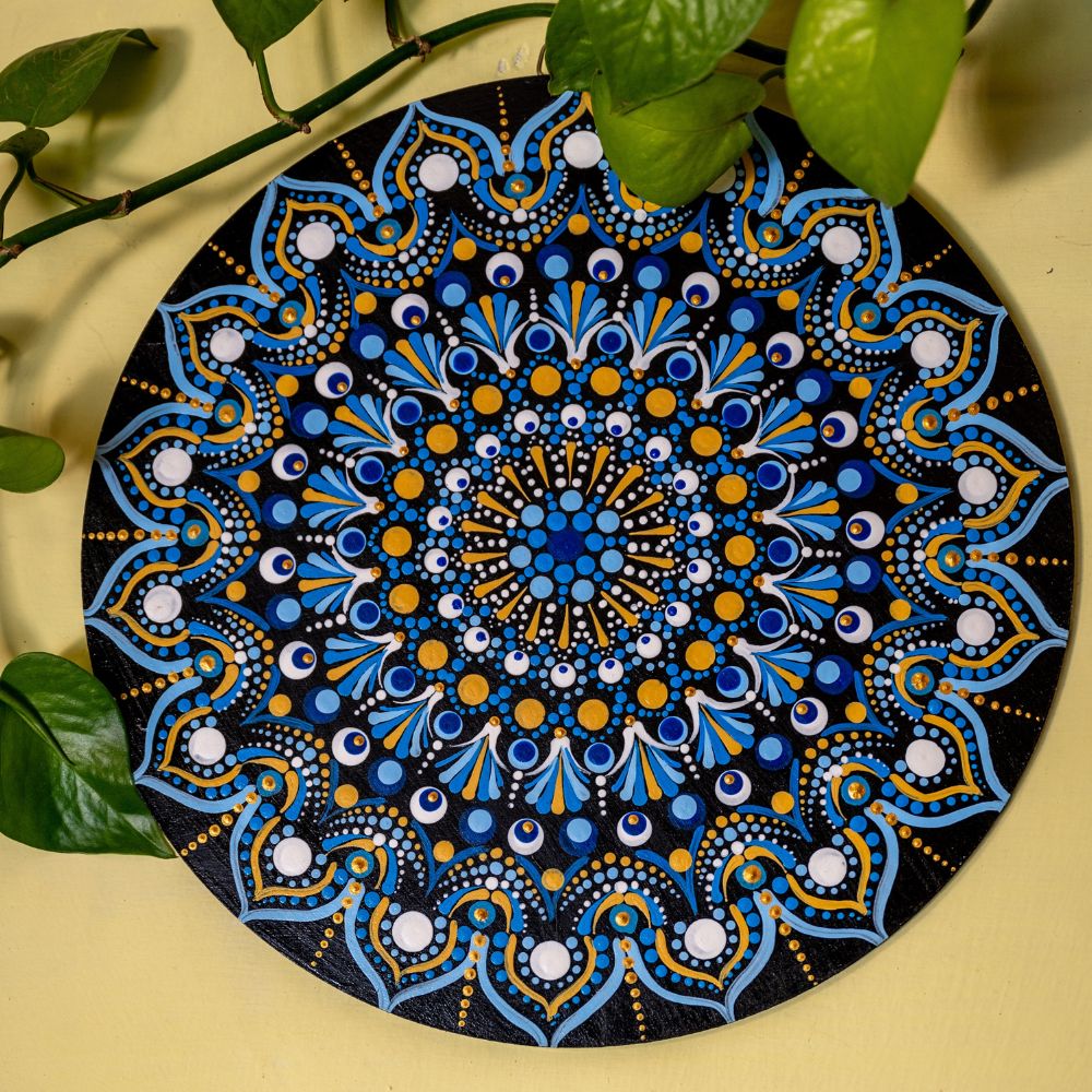 - Handpainted floral mandala enriched with blue, white, and gold tones