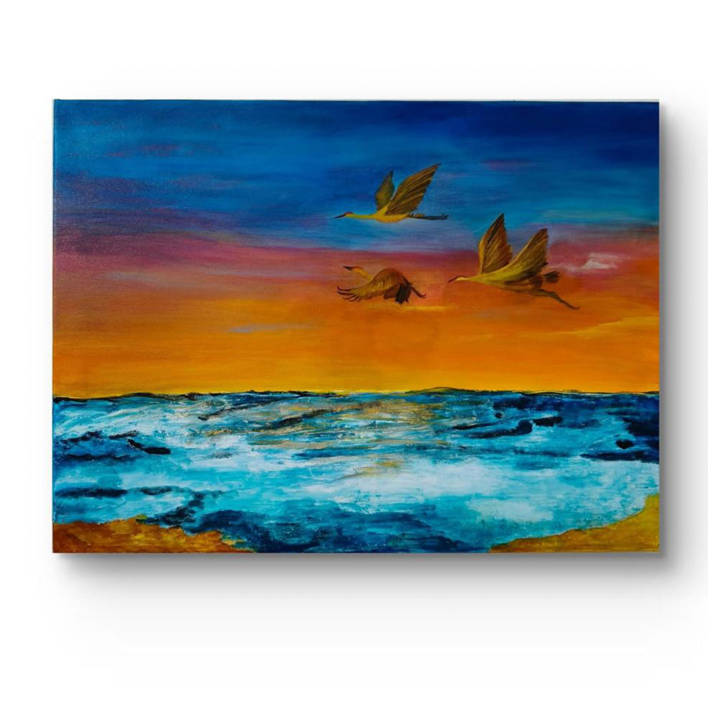 • Handpainted Birds Soaring Over Ocean at Sunset