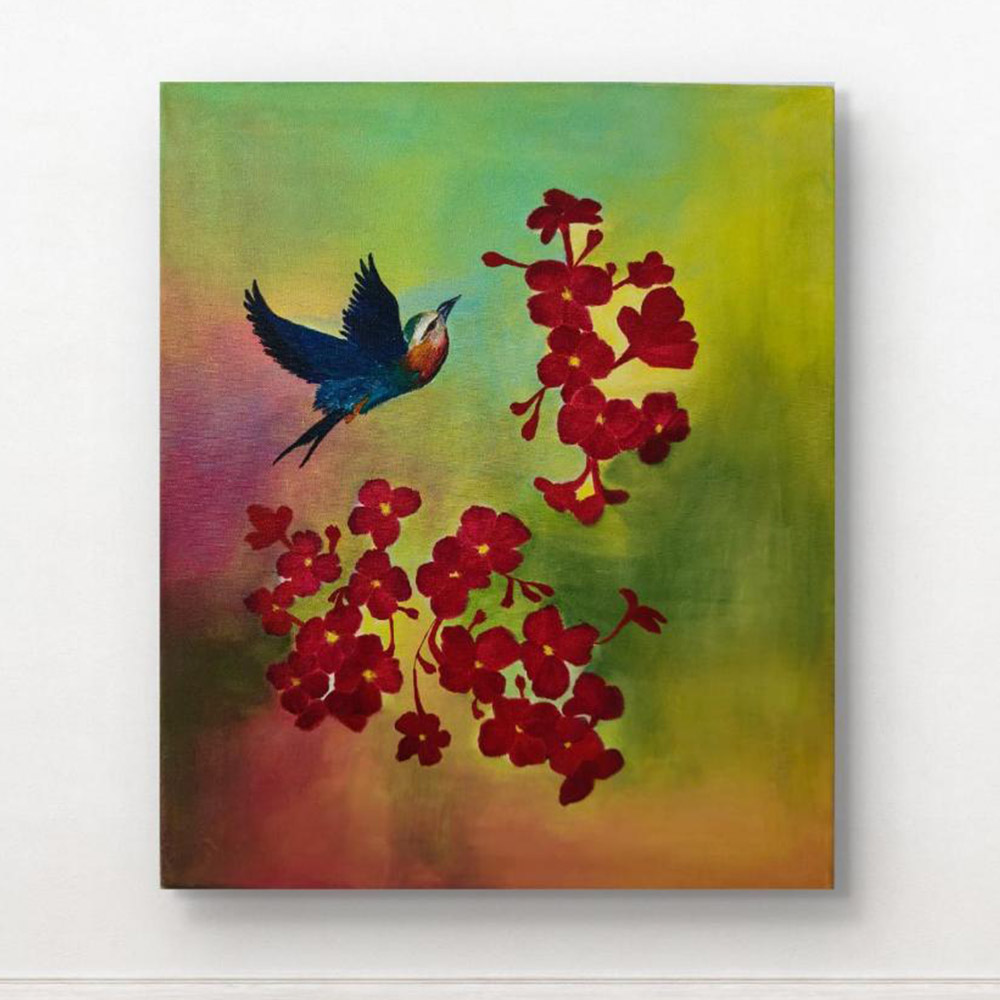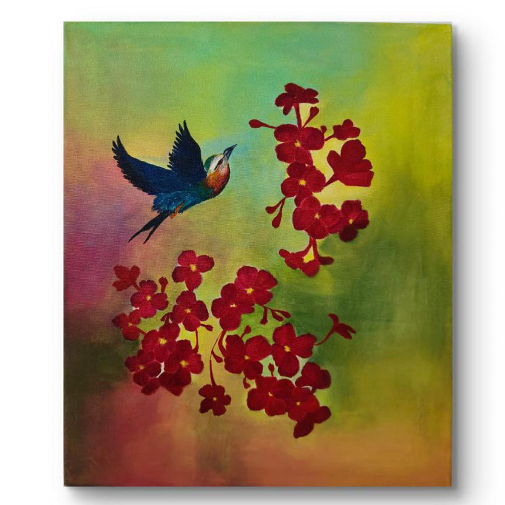 • Handpainted Blue Bird with Vibrant Red Flower Clusters