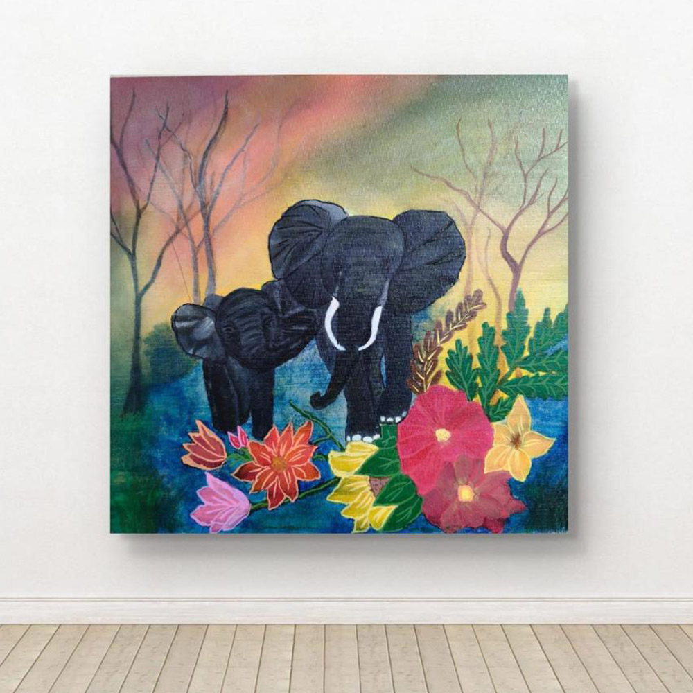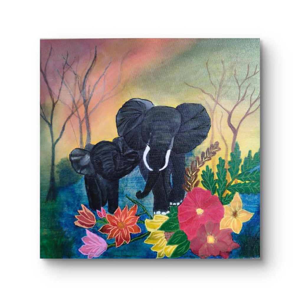 Handpainted Mother Elephant and Calf with Vibrant Flowers