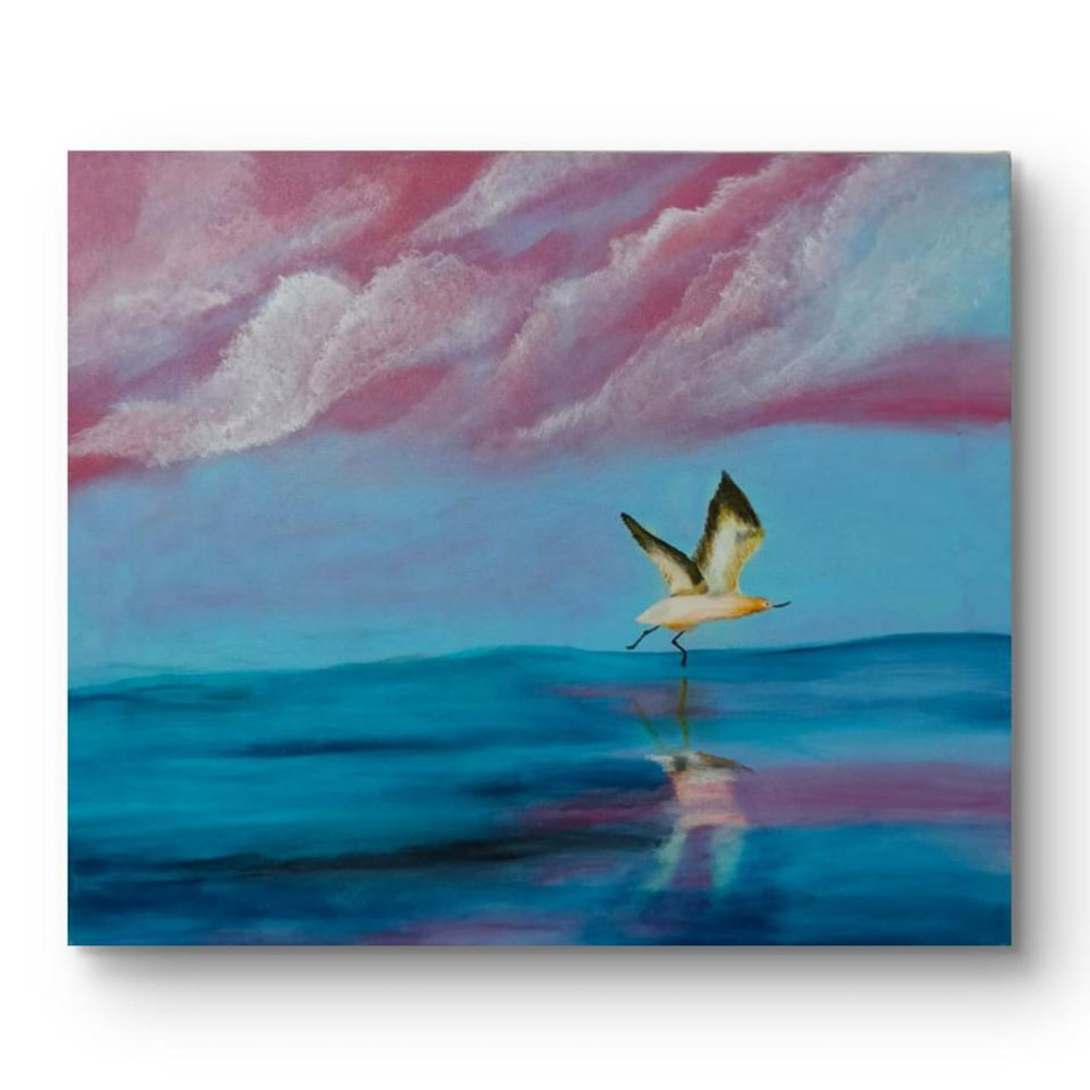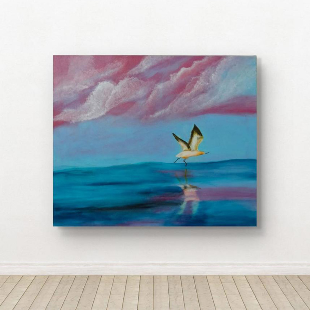 • Handpainted Seabird Skimming Serene Ocean Under Pink Clouds