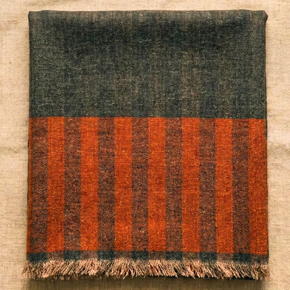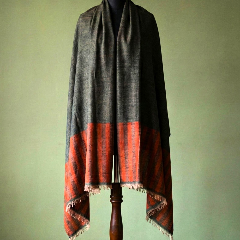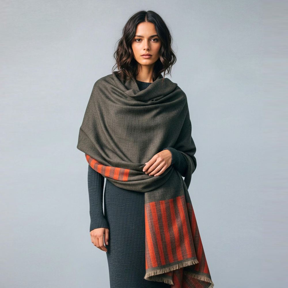 Elevate cold-weather layering with this handwoven wool and cashmere shawl, designed with a deep charcoal-grey body and a warm rust striped border. The refined weave creates a smooth, soft finish with natural insulation, while the contrast border adds a subtle statement without overpowering the look. Lightweight yet cosy, this shawl drapes fluidly over knitwear, coats, and winter dresses for a polished, everyday luxury feel.