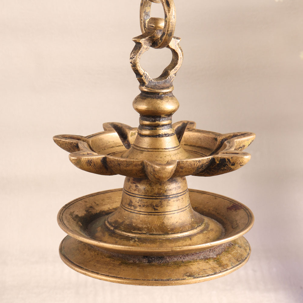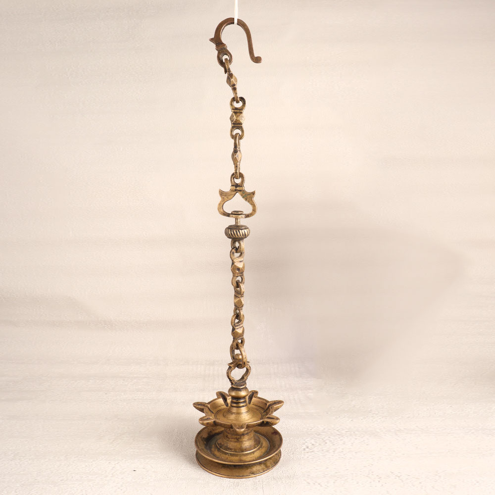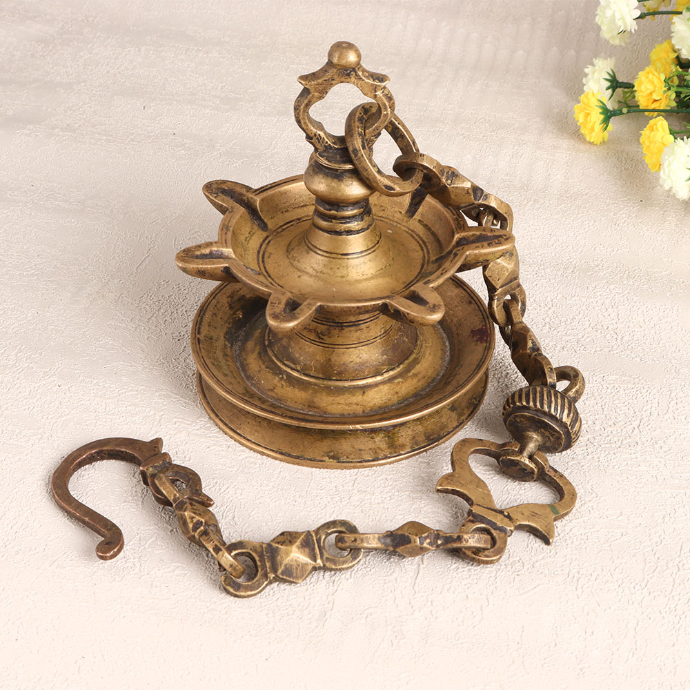 Enhance the ambiance of your living space with our exquisite Vintage Hanging Brass Oil Lamp. This timeless piece is crafted by highly talented Indian artisans that showcases the rich cultural heritage of India. Made from high-quality brass, it boasts an antique brown finish that exudes a warm, rustic charm. The lamp features seven jyots, each ready to be illuminated with either mustard oil or ghee, alongside cotton wicks. With a durable chain for effortless suspension, this lamp is a versatile addition to any setting. Whether you choose to hang it in your home, office, hotel, cafe, shop, restaurant, or prayer room, it serves both a functional and decorative purpose. Ideal for collectors, it adds a touch of vintage sophistication to your collection or exhibition. Moreover, this lamp is perfect for use during prayer ceremonies or auspicious occasions, infusing them with a traditional aura. It's also a meaningful gift for your loved ones on special, festive, or auspicious events, symbolizing the warmth of your affection and best wishes.