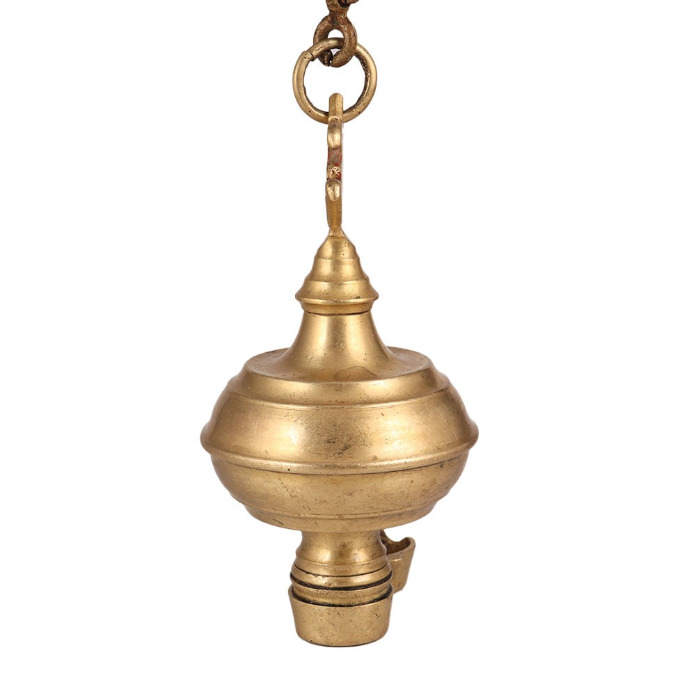 This brass hanging oil lamp is a captivating piece of artistry designed to illuminate your space with a warm, traditional glow. Crafted with precision and skill by professional Indian artisans, this lamp is made from premium brass, ensuring its durability and timeless beauty. The lamp features a stunning antique golden finish that exudes elegance and charm. Adorning its top is a meticulously carved Om symbol, symbolizing peace, spirituality, and harmony. The chain attached to the lamp allows for easy hanging, making it a versatile choice for temples, homes, or any other desired location. Utilizing the traditional method of lighting, the lamp can be ignited using mustard oil or ghee and cotton wick, creating a serene ambiance that spreads positivity and tranquillity. Not only a source of illumination, but this brass oil lamp also serves as a magnificent decorative piece, making it ideal for exhibitions, museum displays, or simply as a stunning centerpiece in your home. It makes for an incredible gift option, expressing your heartfelt wishes and blessings to your loved ones during special, festive, or auspicious occasions.