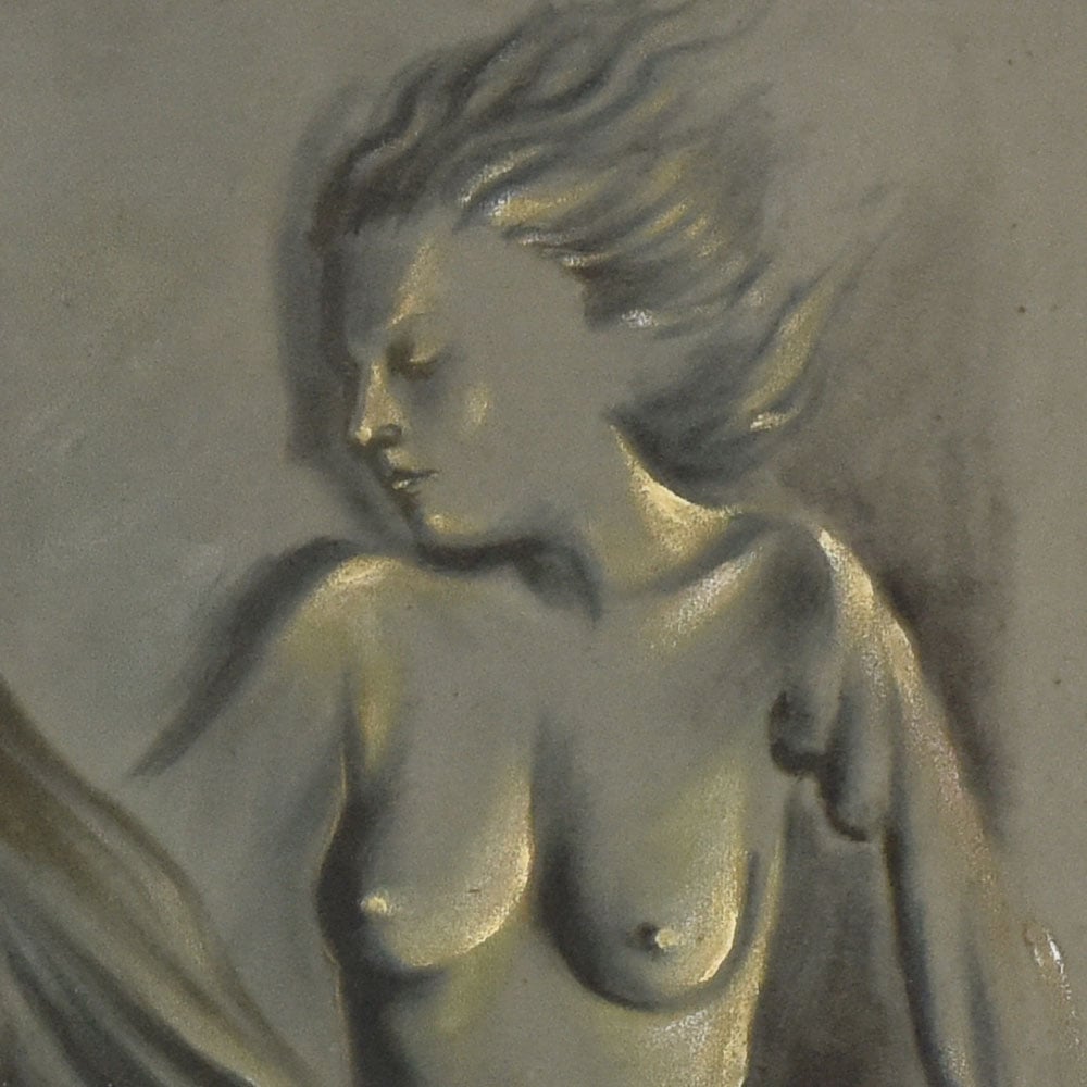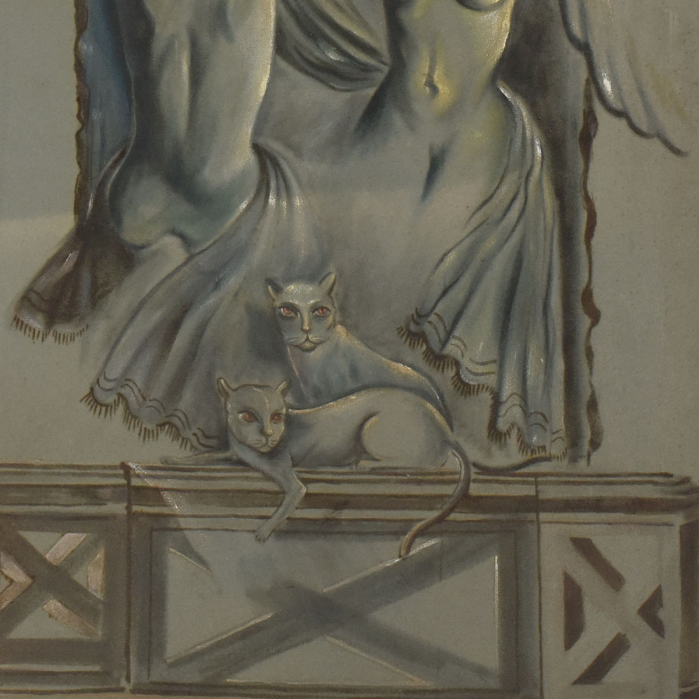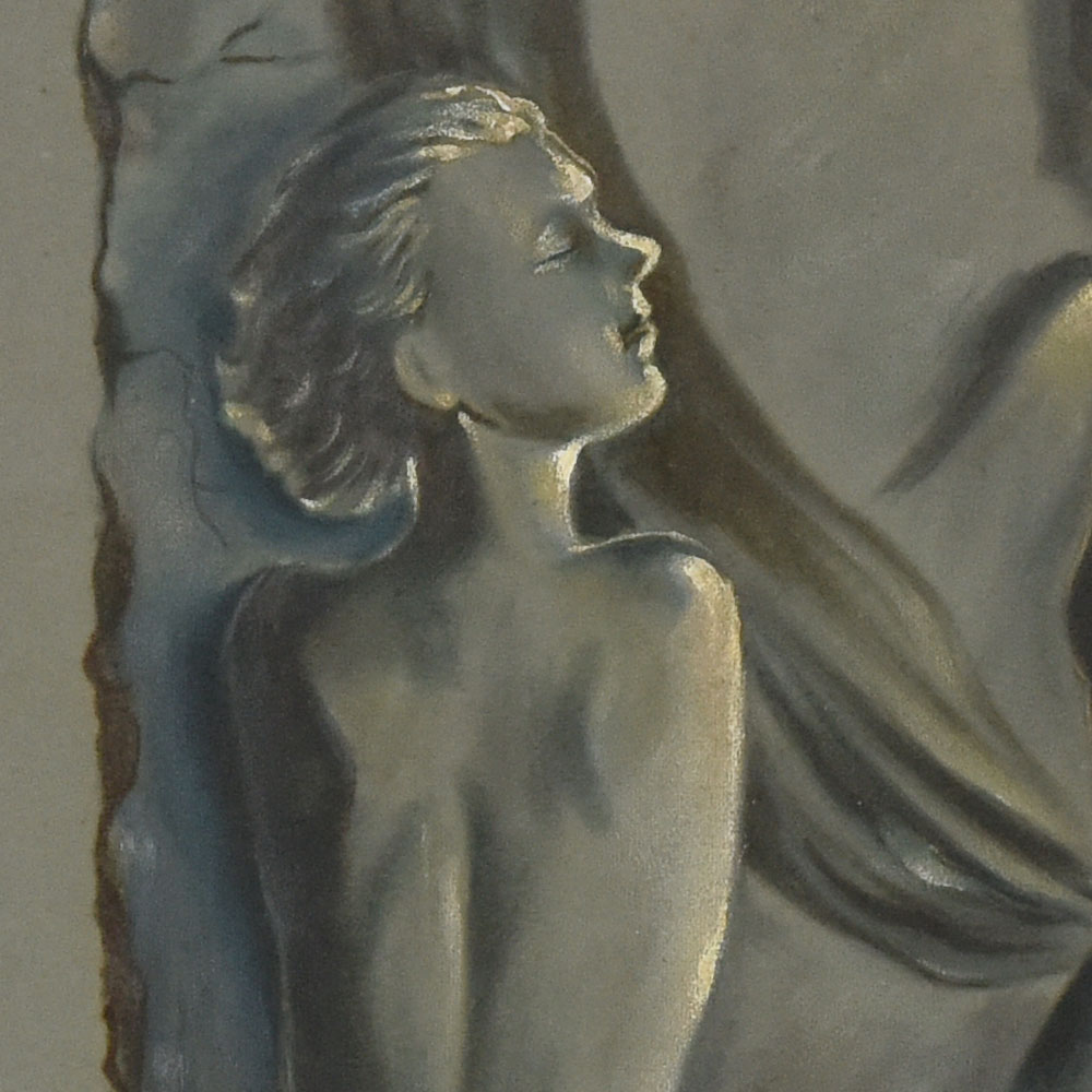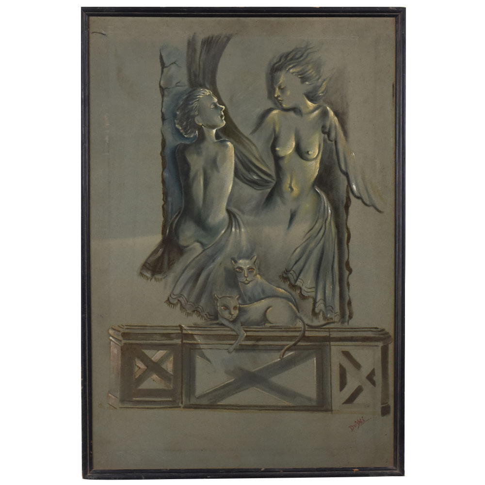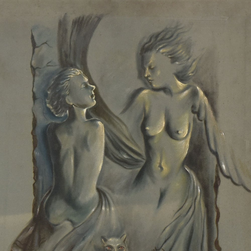 This striking hardboard painting by artist Drishti presents a surreal and dreamlike composition that blends human elegance, animal symbolism, and emotional depth. The scene depicts two ethereal female figures, partially draped in flowing garments, their forms emerging from a textured backdrop. One figure gazes upward with a sense of curiosity and contemplation, while the other leans forward with an intense and almost protective presence. Beneath them, two sleek cats rest gracefully on a decorative ledge, their sharp eyes and poised bodies adding an air of mystery. The feline figures, often symbolic of intuition, independence, and silent power, complement the enigmatic mood of the artwork. The muted palette of silvery blues, grays, and soft highlights creates a sculptural effect, enhancing the painting’s atmospheric quality. Rendered on hardboard, this piece captures both refined detail and bold form, making it a statement work for collectors and admirers of surreal, symbolic, and thought-provoking art. Its layered meaning and visual intrigue make it an unforgettable focal point in any art collection or elegant interior space.