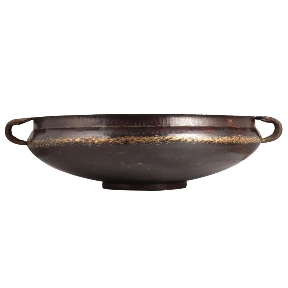 A heavy vintage style Urli made of brass metal alloy. It was handmade by local Indian workers from South India using ancient methods. It is engraved with alluring motifs on the surface and handles. It has a dark brownish colour with gold colour carvings. Use it as a flower pot for decoration in your home, office, restaurant or shop. The flower pot is a real eye-catcher on entrance. Display it in your vintage collection, a first choice for vintage collectors. Housewarming, Diwali or New Year gift for your loved ones.