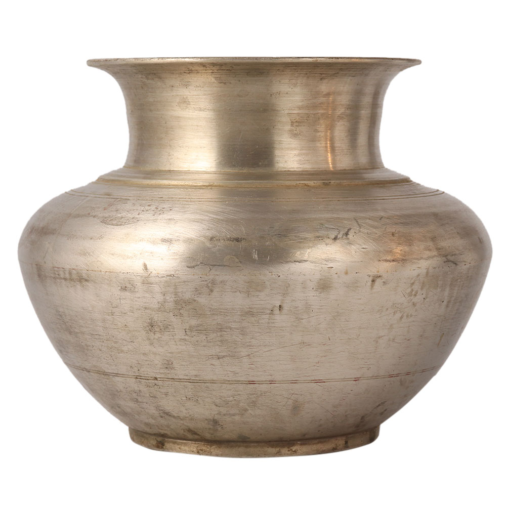 This heavy holy water pot has vintage style carving with circular rings on the sides. It is made of a white metal alloy. It is used for the morning sun prayer where water is offered to the sun. It is believed that offering water to the sun makes the person discipline and maintains the balance of body and mind.