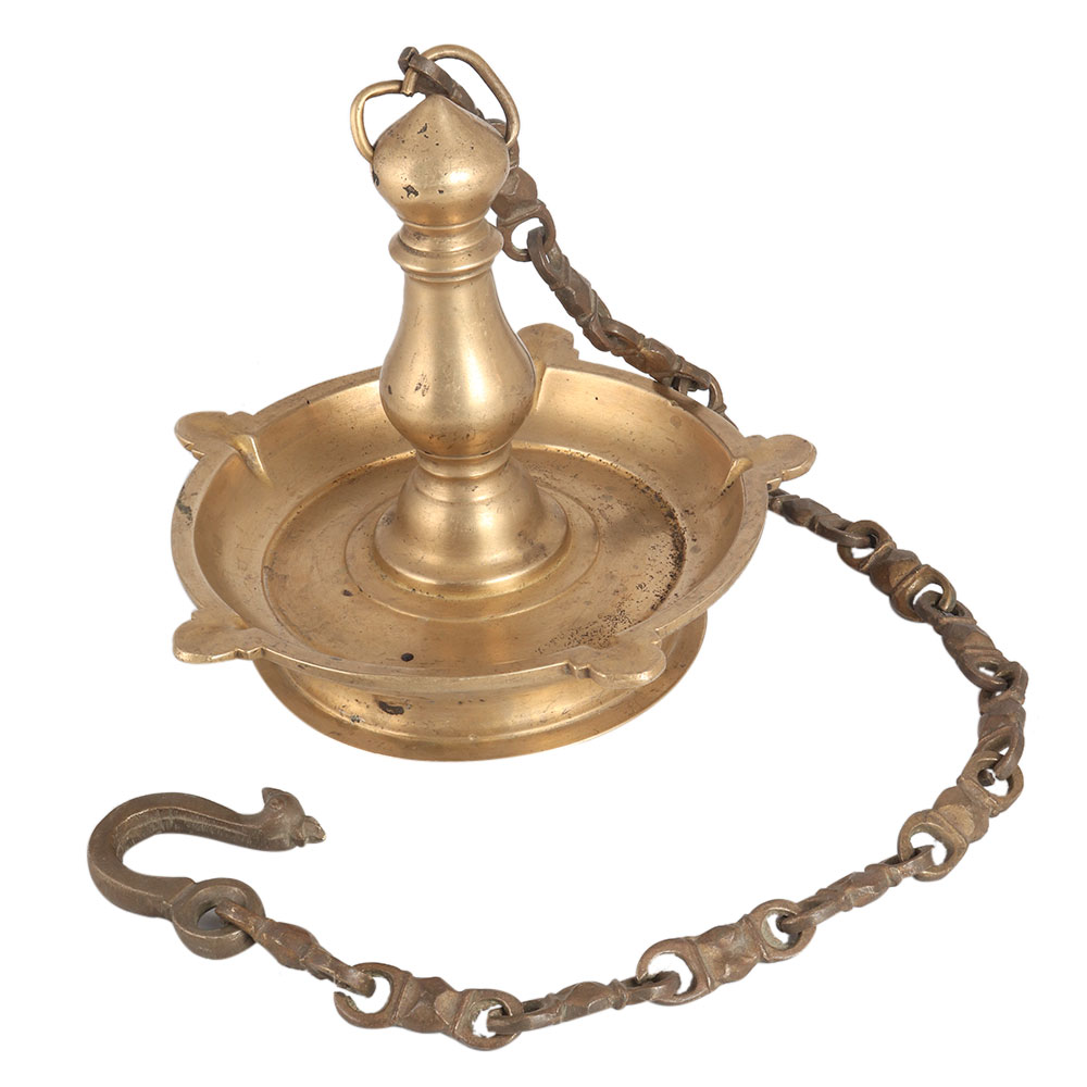 This vintage Sara Vilakku or hanging oil lamp has a heavy weight. Sara Vilakku is a South Indian name for hanging oil lamps. It was carved from brass by skilled Indian craftsmen in South Indian art. It has a chain with a hook. The hook end is carved in a peacock head that looks alluring with its intricate details. Light the lamp with ghee or mustard oil with cotton wicks and hang it in your home to beautify the interior. A gift for the occasion of Diwali, anniversary or farewell.