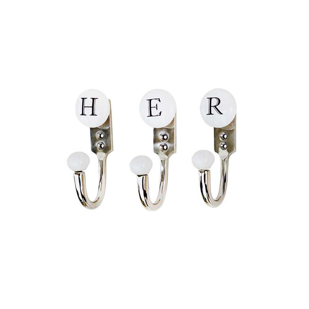 HER white and black alphabet hooks (combo pack). When put on wall or cabinet it is an art in itself. This hook is strong enough to hold your keys, tea cups, hand towels, cloths etc.