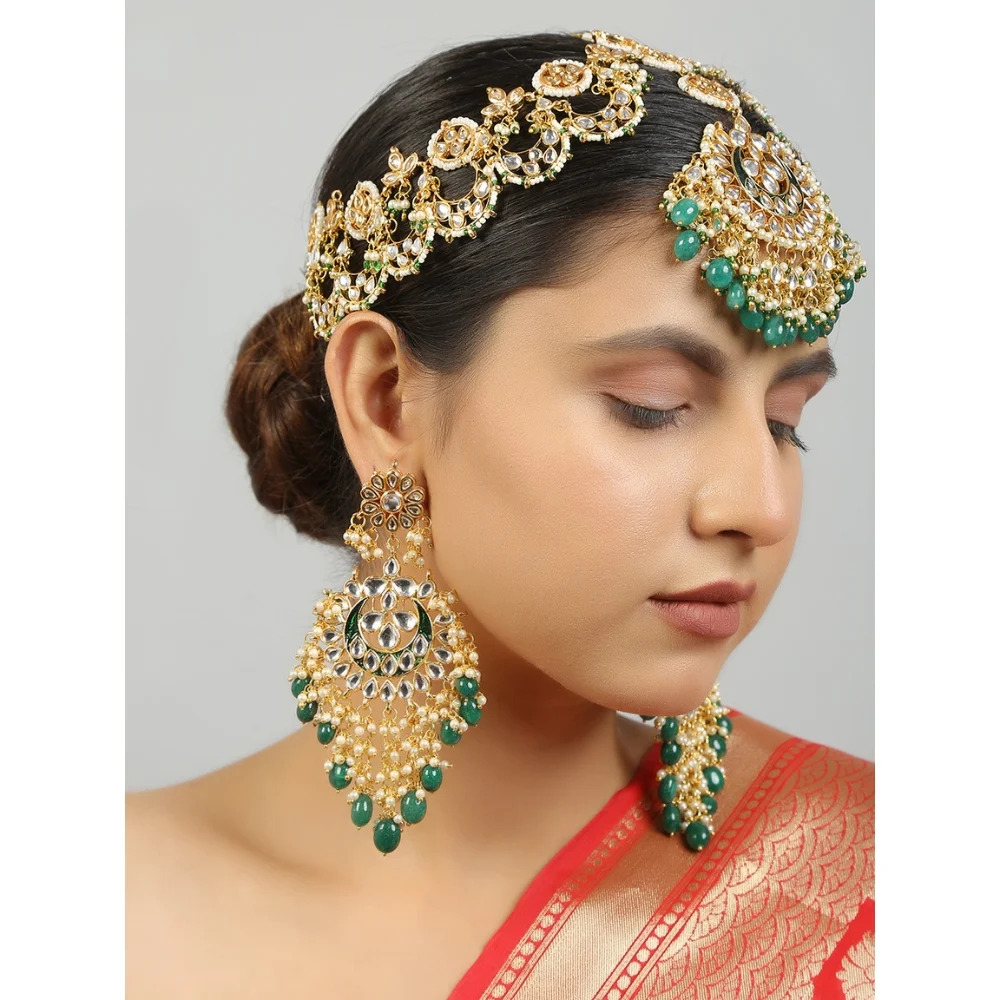 The Heritage Crescent Kundan Bridal Jewelry Set captures the grandeur of classic Indian wedding adornment. Crafted in polished golden brass, this jewelry set features intricate Kundan style stone settings arranged in a graceful crescent inspired design. The elegant structure highlights the neckline with royal presence while maintaining traditional artistry. With its 12 inch silhouette, this handcrafted ensemble reflects timeless bridal elegance suited for ceremonial celebrations.