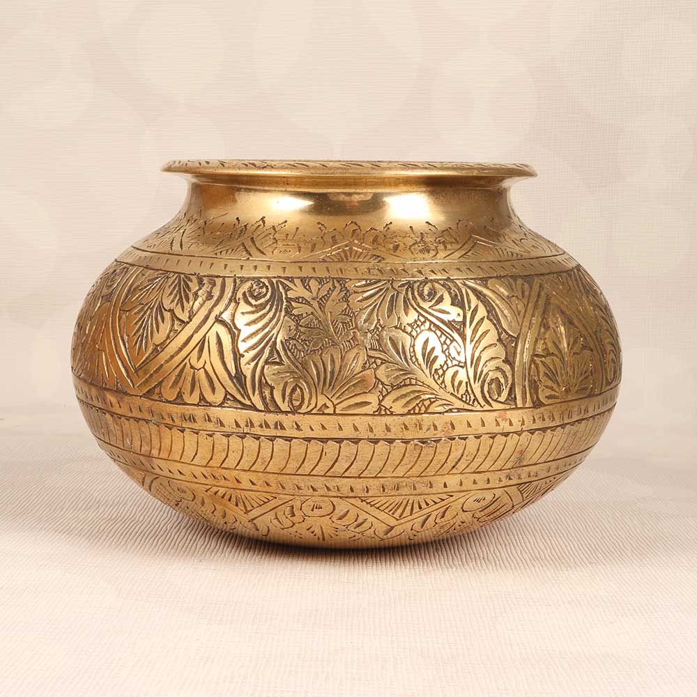 This gorgeous vintage brass cooking pot from South India adds an exotic touch of charm to any space. The intricate engraving and patina of age lend a sense of history and visual interest to its smooth, curved form. While no longer suitable for cooking use due to its age, this brass pot makes for a striking decorative piece. Its rich, warm tones and elegant shape will elevate your living room, bedroom or entryway decor. Place it on a console table or bookshelf to showcase its artistic engraving. Fill it with fresh flowers or trailing vines to highlight its vessel shape. However you display it, this vintage brass pot is sure to spark conversation and delight your guests. Bring the warmth, beauty and nostalgia of years past into your home with this antique treasure.