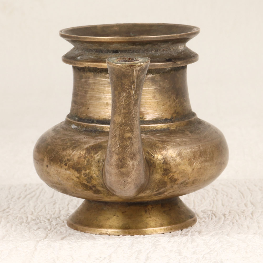 This Vintage Brass Pot with Spout is a timeless piece meticulously handcrafted by highly talented Indian artisans from South India. Crafted with precision and devotion, this pot is made from high-quality brass, showcasing an authentic antique brown finish that adds a touch of elegance to any space. Primarily designed for use during prayers, rituals, and havans, this pot serves as a sacred vessel to hold holy water. Its spout ensures a graceful and controlled pour, making it an essential accessory for spiritual practices. Beyond its spiritual significance, this pot doubles as a captivating decor item suitable for homes, offices, restaurants, hotels, or cafes, particularly within prayer rooms. The pot's vintage charm makes it a delightful addition to any collection of antiquities. Its versatile aesthetic makes it an excellent gift choice for loved ones on special, festive, or auspicious occasions.