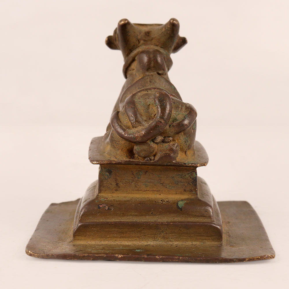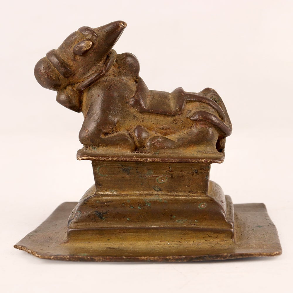 Buy a small sitting Nandi brass statue that is meticulously handcrafted by highly talented Indian artisans hailing from the picturesque landscapes of Himachal Pradesh. This magnificent piece captures the essence of devotion and artistry in a stunning antique brown finish, adding an aura of antiquity and grace to any setting. Lord Nandi, the sacred bull vahana of Lord Shiva, symbolizes strength, loyalty, and unwavering devotion. This finely detailed statue not only embodies the spiritual significance of Nandi but also showcases the artistry and mastery of traditional craftsmanship. Perfect for adorning homes, offices, restaurants, hotels, cafes, or shop prayer rooms, this statue serves as both a divine symbol for worship and an exquisite decoration. Its versatile design harmoniously blends with various aesthetics, making it an ideal addition to any space. Collectors of vintage art will find this piece a treasured gem, while its elegance makes it a thoughtful gift for your loved ones on special, festive, or auspicious occasions.