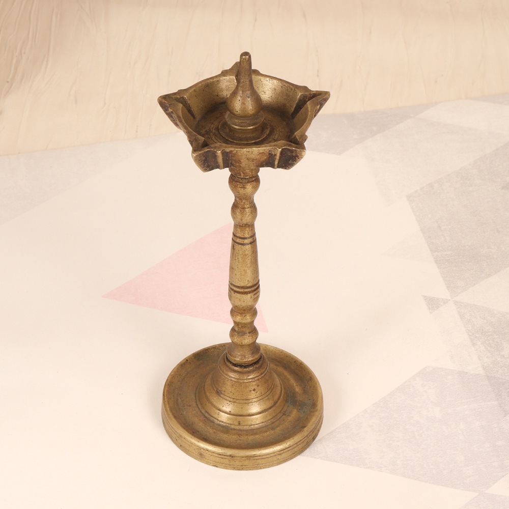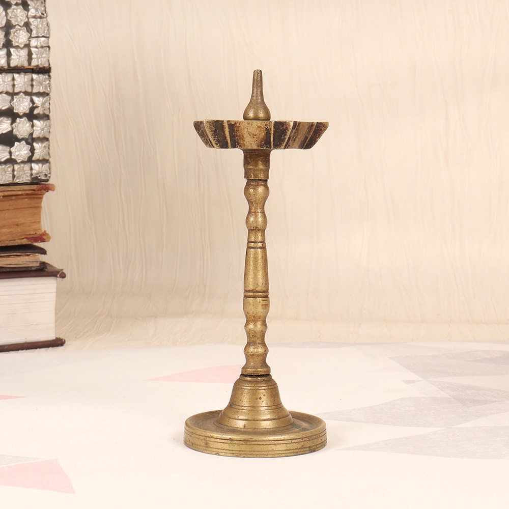 Illuminate your space with the timeless elegance of our Vintage Brass Oil Lamp. Crafted with intricate South Indian artistry, this captivating lamp is a testament to the rich cultural heritage of the region. Embrace the soothing ambiance of a bygone era with this stunning brass oil lamp. The gentle flickering of the five flames creates an enchanting atmosphere, perfect for unwinding after a long day or setting the mood for quiet contemplation. The warm, natural light emanating from the jyots will transport you to a time of simple pleasures and timeless beauty. Whether you're seeking to elevate your meditation practice, create a cozy reading nook, or simply add a touch of timeless elegance to your home, this brass oil lamp is the perfect companion. Its versatility allows it to seamlessly blend with a variety of decor styles, from rustic farmhouse to modern minimalist. Invite the captivating glow of this South Indian-inspired masterpiece into your life and experience the transformative power of light.