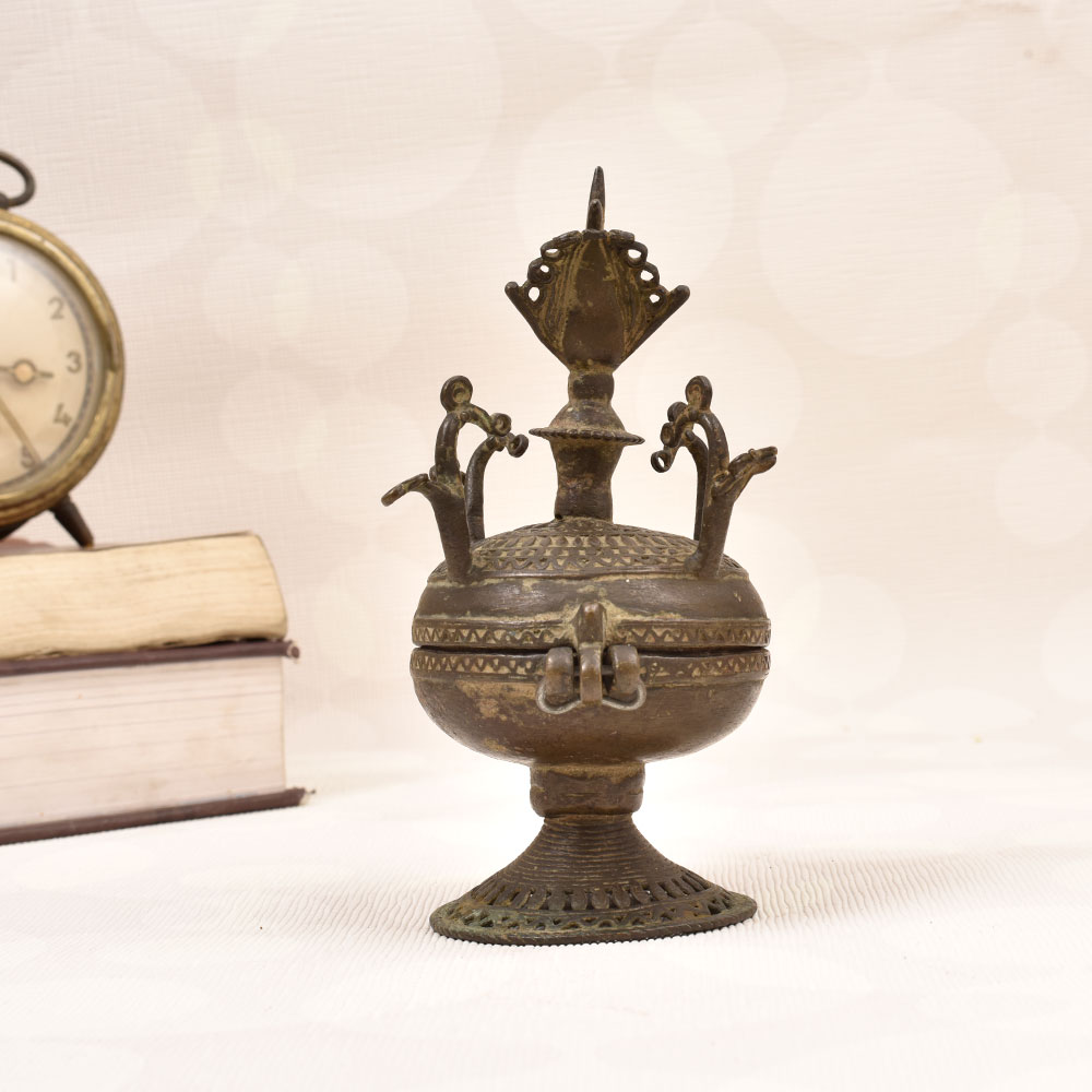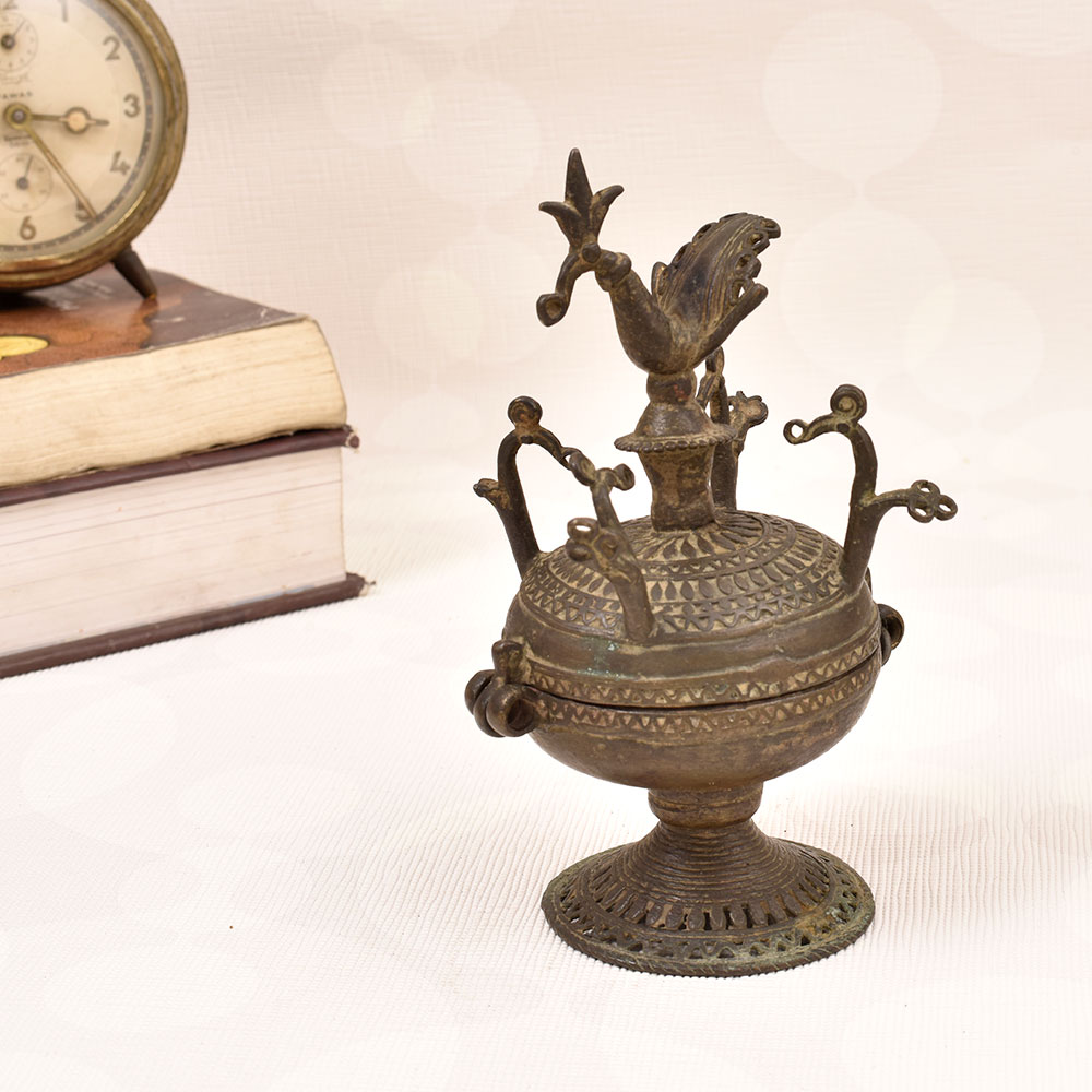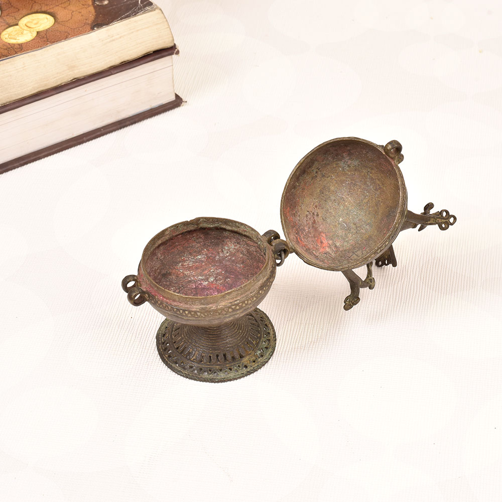 Embrace the captivating allure of tradition with our exquisite Vintage Brass Sindoor Box. Crafted with meticulous attention to detail, this heirloom-quality piece combines timeless elegance with functional beauty. This sindoor box is more than just a storage solution - it's a stunning work of art that elevates your daily ritual. Imagine the satisfying click as you open the lid to reveal your vibrant sindoor, ready to grace your forehead with tradition and grace. Whether you're looking to upgrade your own routine or seeking a thoughtful gift for a loved one, this vintage brass box is a true celebration of Indian heritage. Its classic design and eye-catching peacock motif will seamlessly blend into any decor, serving as a beautiful reminder of your cultural identity. Experience the joy of honoring your roots with every use of this exquisite sindoor box.