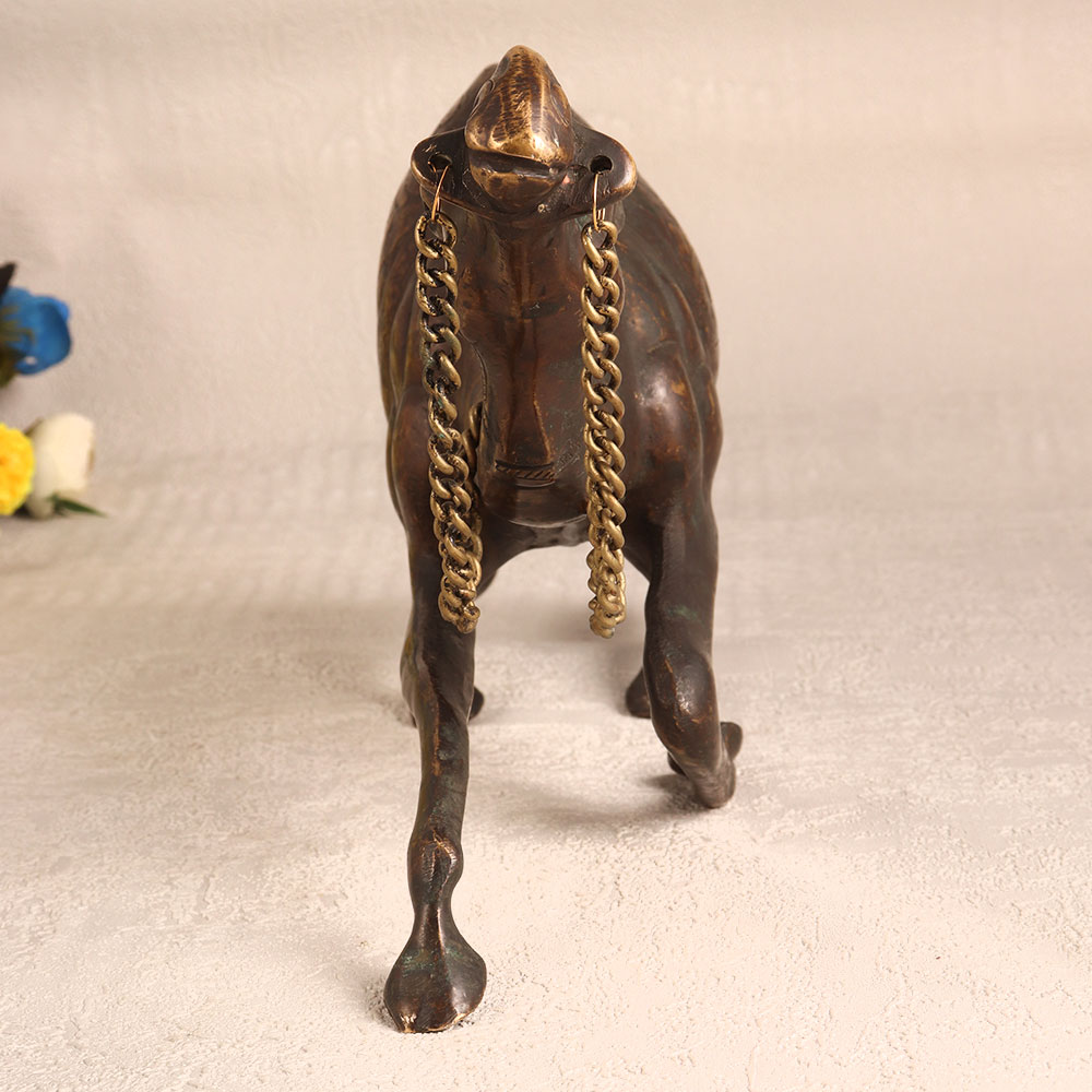 A brass statue of a half-sitting camel that is skillfully crafted by talented Indian artisans. This exquisite piece showcases a captivating antique brown finish, adding a touch of timeless elegance to any setting. Handmade with the utmost precision and care, this brass camel statue exemplifies the rich tradition of Indian craftsmanship. Its intricate details and high-quality brass construction ensure a lasting and beautiful addition to your decor. Versatile and versatile, this stunning camel statue is the perfect choice for elevating the ambiance of your home, office, hotel, cafe, shop, or restaurant. Its unique blend of artistry and vintage charm makes it an excellent addition to your antique collection or a captivating exhibit piece. Moreover, this exceptional brass camel statue is a thoughtful and symbolic gift for your loved ones on special, festive, or auspicious occasions. Its cultural significance and timeless design will be cherished by those fortunate enough to receive it.