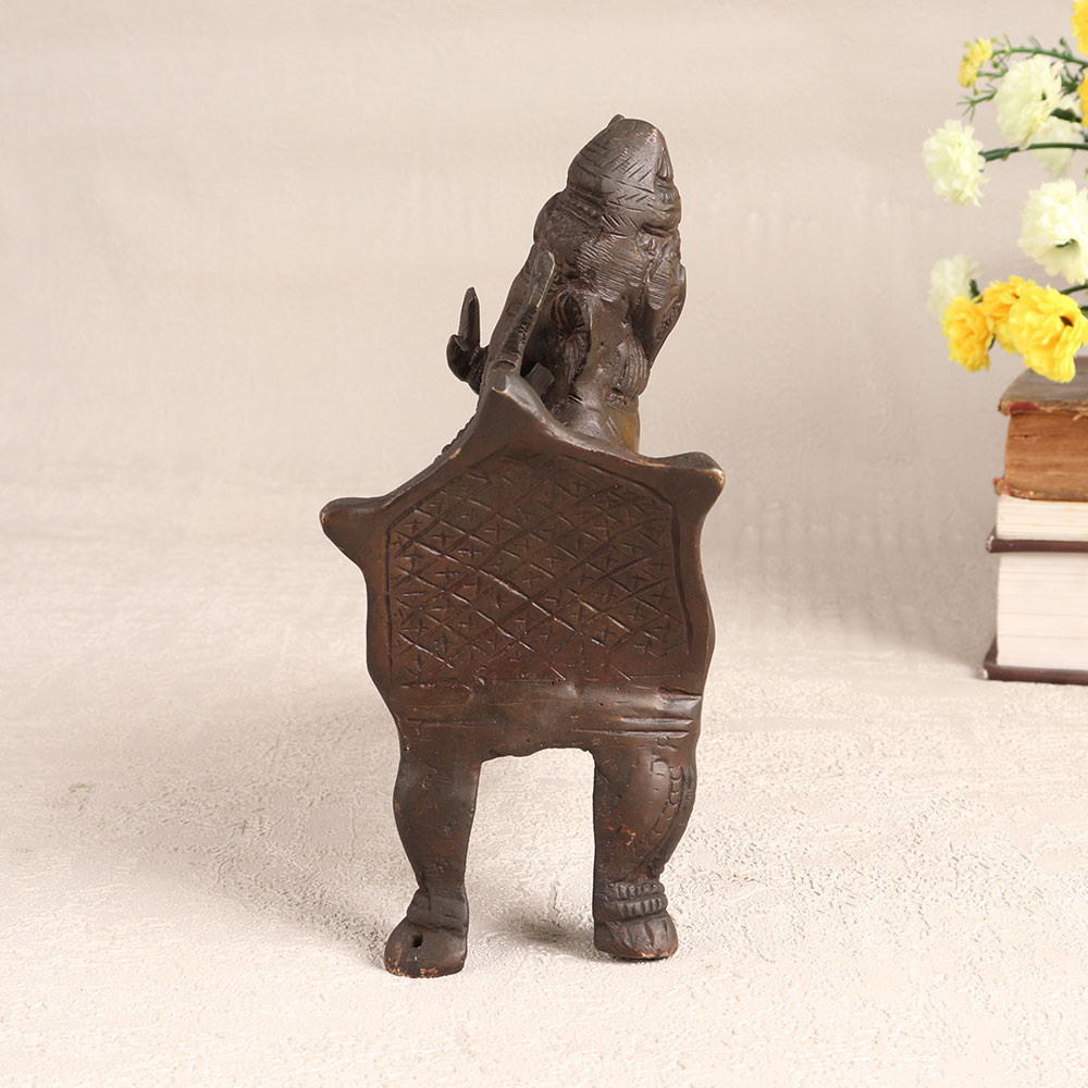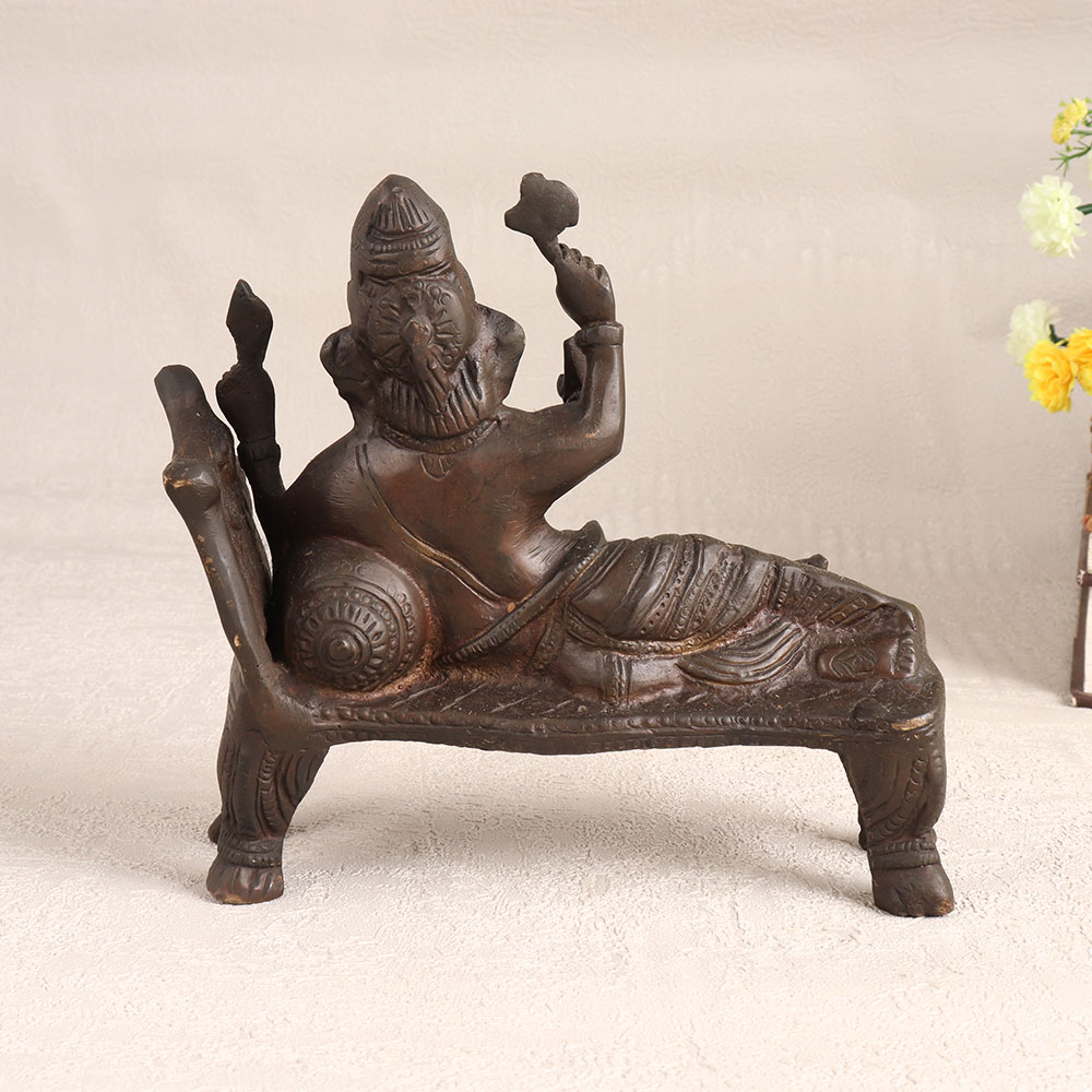 A stunning brass statue of Lord Ganesha that is crafted by highly skilled Indian artisans with unwavering devotion and precision. Lord Ganesha, the revered deity known for removing obstacles and bestowing blessings, is depicted resting on a majestic throne, radiating an aura of divine tranquillity. The antique dark finish adds a touch of vintage charm, making this statue a conversation starter and a rare collector's item. Whether you place it in your home, office, hotel, cafe, shop, or restaurant's prayer room, it brings an air of serenity and spirituality to any setting. Its intricate detailing and craftsmanship make it a cherished addition to your vintage collection or a captivating exhibit for special events. Additionally, this brass Ganesha statue is a thoughtful gift, perfect for your loved ones on special, festive, or auspicious occasions.