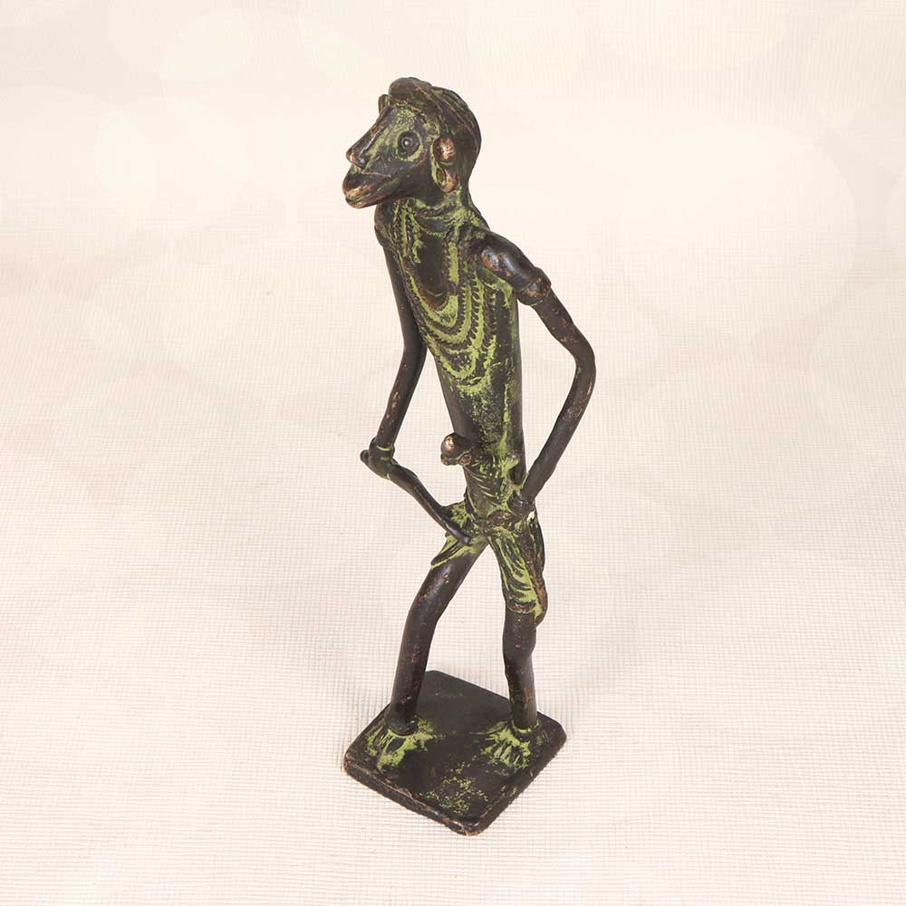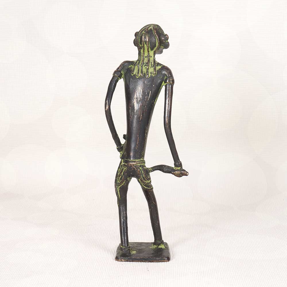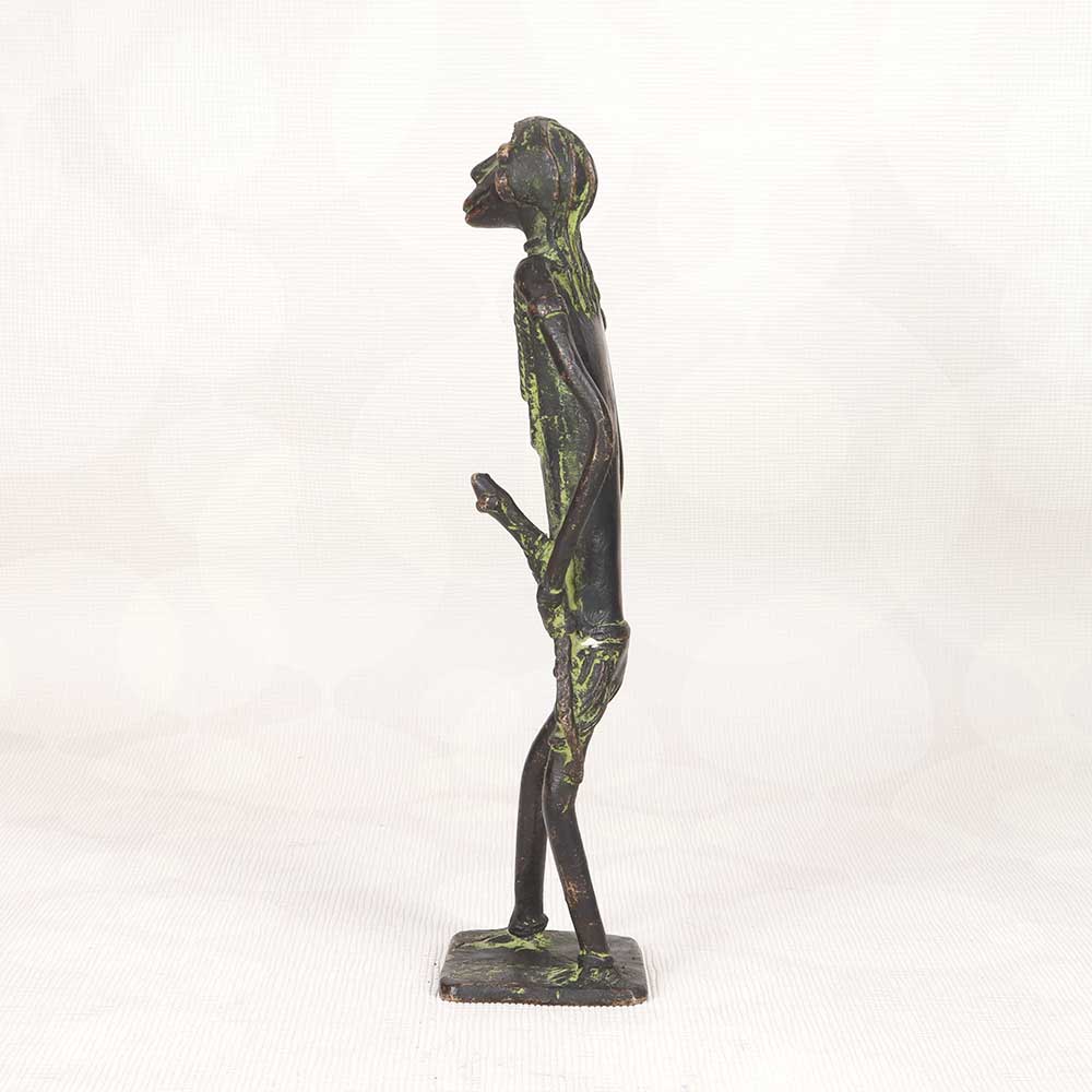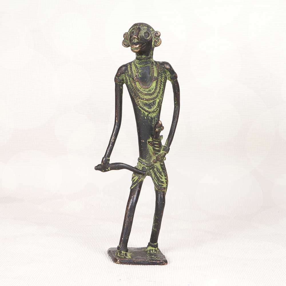 Elevate your home decor with an exotic touch of tribal art in the form of this striking brass statue of a tribal man. Standing tall with a fierce gaze, this handcrafted Bastar Art statue depicts a tribal hunter holding a fish in one hand and a knife in the other, representing the connection between man and nature. The bold, muscular form of the tribal man is sculpted with fine details like engraved patterns on the clothing and jewelry. The brass finish lends an antique, vintage look. At over a foot tall, this substantial statue makes a statement wherever it's displayed. Place this tribal man statue in an entryway or living area to add an artistic accent that sparks conversation. The raw, primal vibe calls to mind man's ancestral roots and oneness with the natural world. An ideal gift for world travelers and art collectors drawn to exotic cultural artifacts. With its timeless tribal design, this statue brings an intriguing touch of global artisanship to your home.