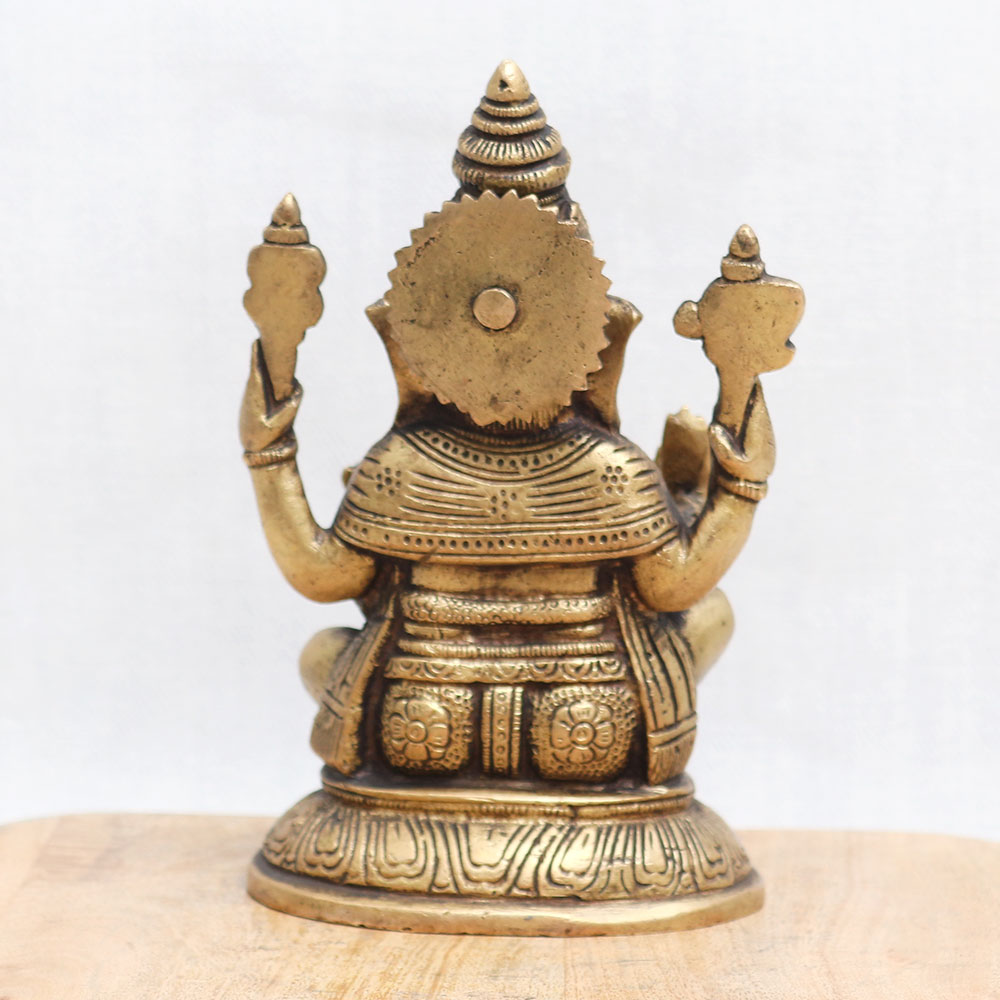 A remarkable vintage bronze murti of Lord Ganesha, seated majestically with his beloved vahana, the mushak, in front of him. Crafted with meticulous detail and finished in an enchanting antique brown, this exquisite piece serves as a significant symbol of divine devotion. Handmade by professional Indian artisans using high-quality bronze, this murti exudes a timeless elegance that adds a captivating touch to any interior decor. Embraced by countless temples, this sacred bronze statue holds a place of reverence in Hindu worship. Bring the divine presence into your own temple, or adorn your home, office, cafe, restaurant, gym, or hotel temple with this remarkable masterpiece. Its presence radiates positive energy and spiritual significance, creating an atmosphere of serenity and prosperity. This bronze murti is an auspicious choice for your loved ones on special, festive, or auspicious occasions. Explore our collection of Hindu god statues online and discover the perfect god idol or showpiece that resonates with your soul, connecting you to the divine realm.