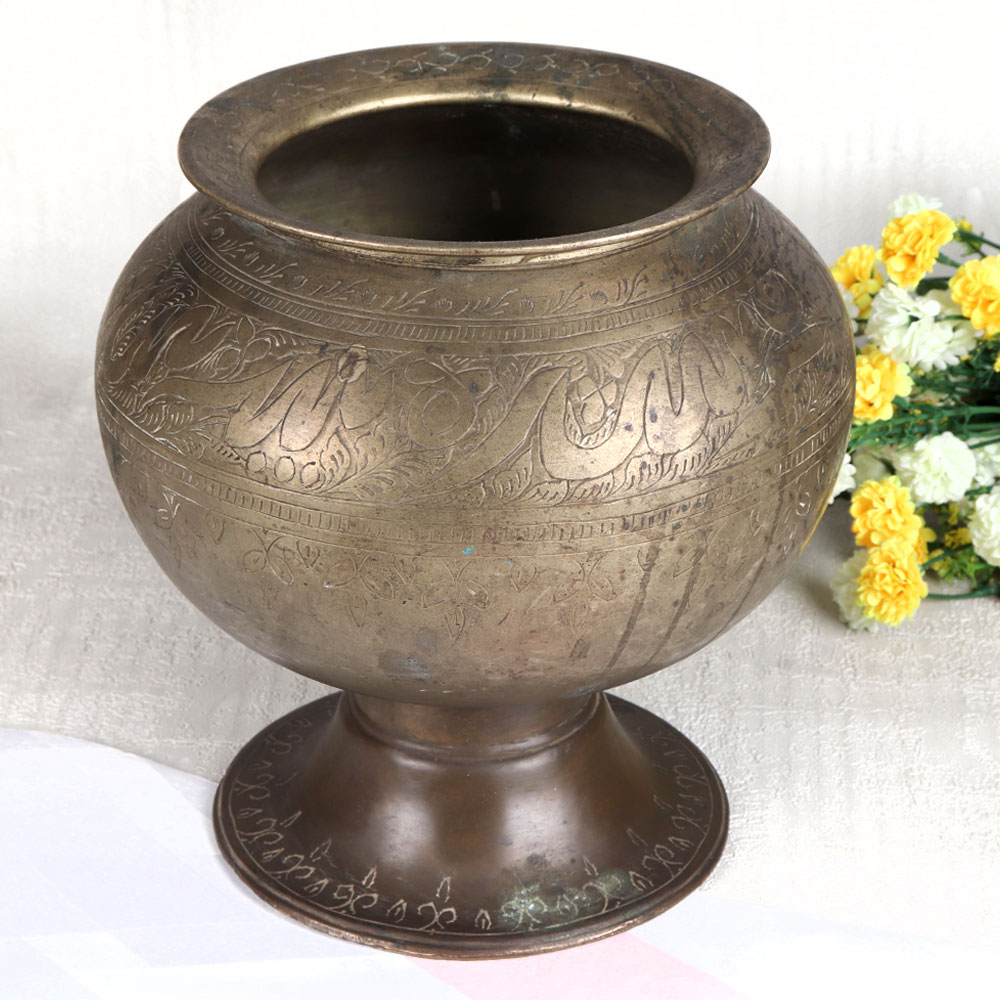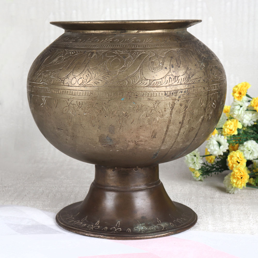 Buy a Vintage Brass Cooking Pot online and get a hassle free delivery right at your doorstep. This exquisite piece exudes the charm of a bygone era and handcrafted with precision by professional Indian artisans from Gujarat. Made from high-quality brass, it boasts an antique brown finish that highlights its timeless beauty. What sets this cooking pot apart are the intricate engravings that adorn its surface, showcasing the rich heritage of Indian artistry. These engravings tell a story of tradition and elegance, making it a stunning addition to any space. While its historical roots are in the kitchen, we recommend using it primarily for decorative purposes due to its vintage nature. This versatile piece can grace your home, office, restaurant, hotel, cafe, or shop, adding a touch of classic charm. It doubles as a unique flower pot, infusing life and style into any setting. Perfect for collectors, enthusiasts, or those seeking distinctive decor, this Vintage Brass Cooking Pot can be proudly displayed in your vintage collection or showcased at exhibitions. It also makes for a thoughtful gift on special, festive, or auspicious occasions, spreading the joy of timeless artistry and history.
