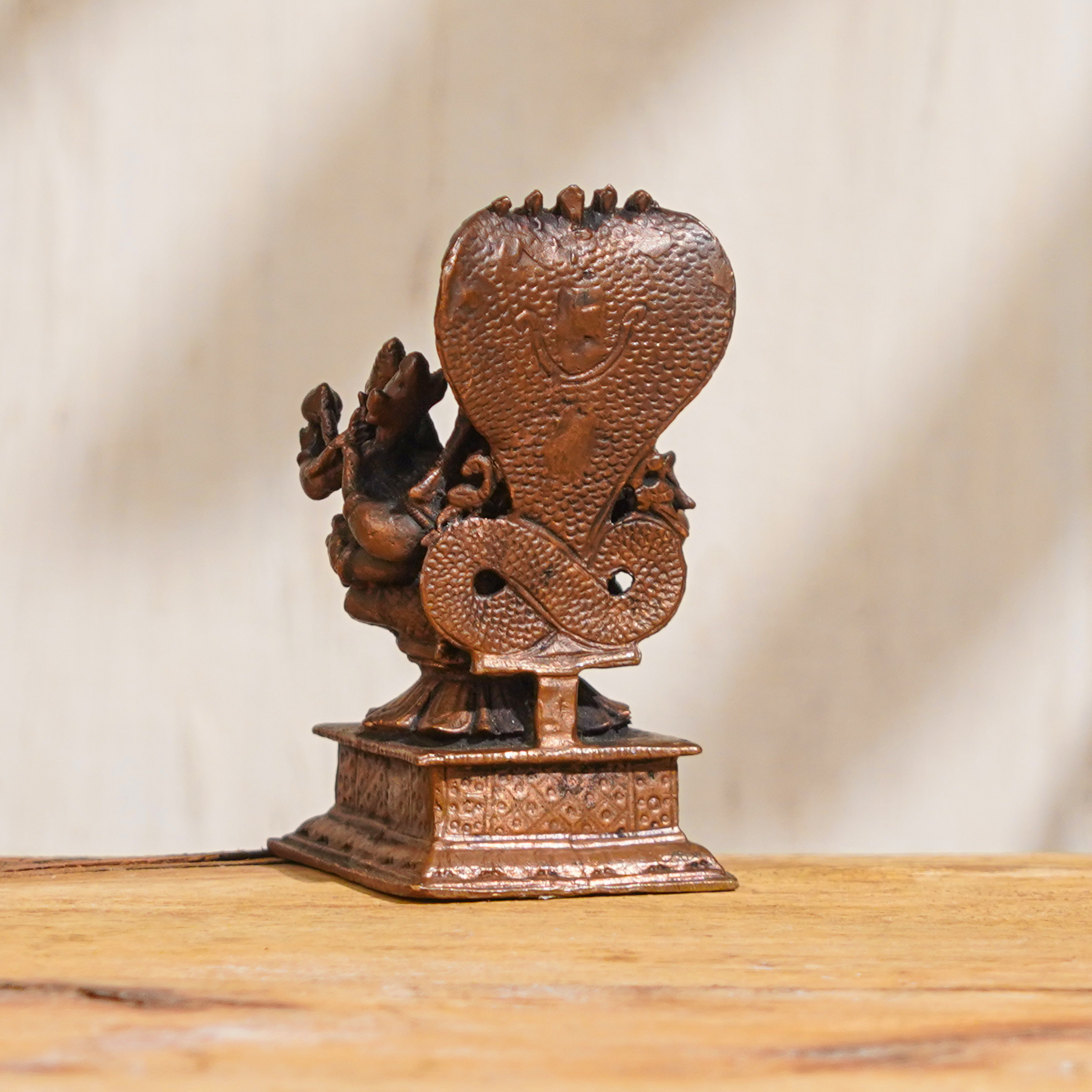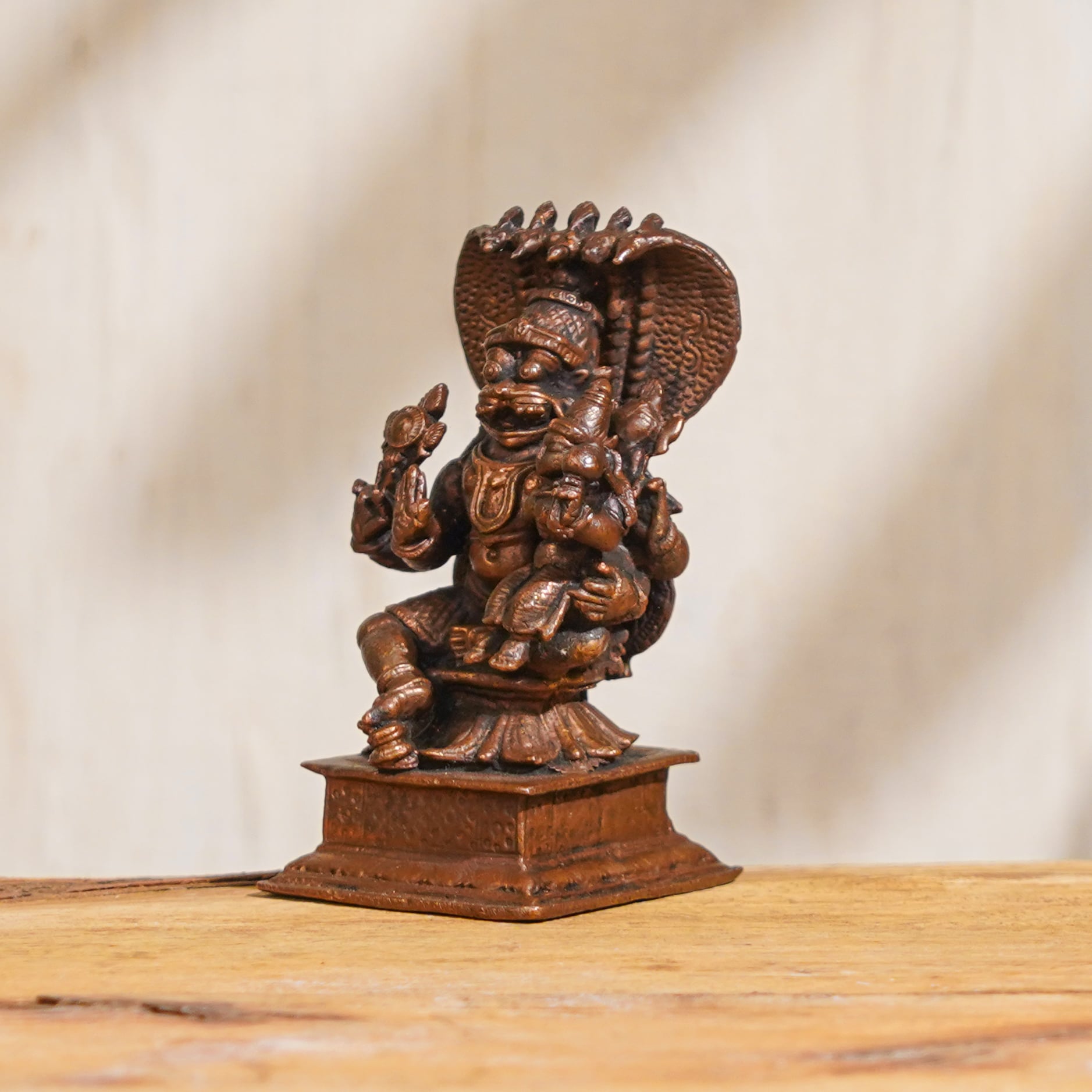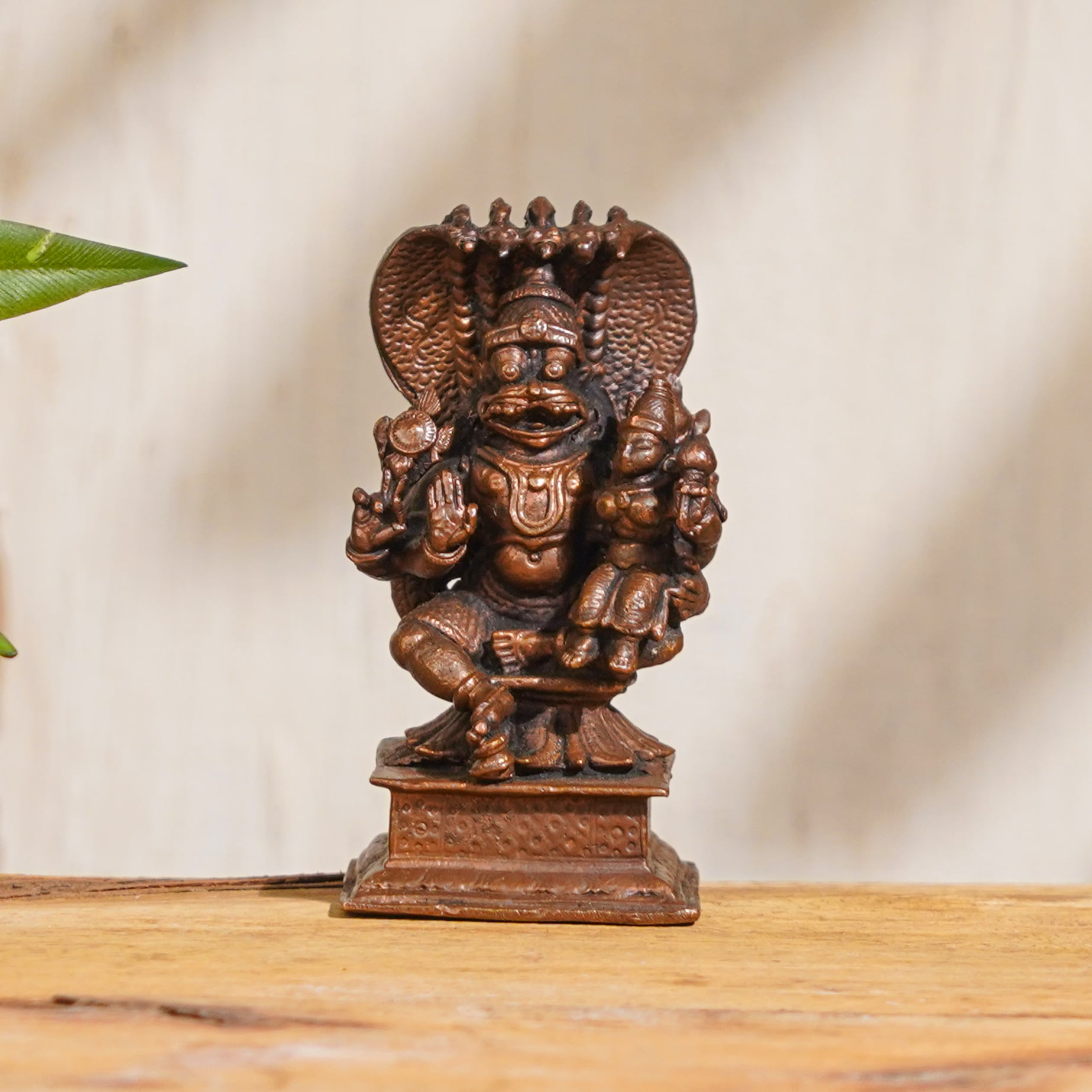 This exquisite copper statue portrays Lord Narasimha, the powerful half-man, half-lion avatar of Lord Vishnu, with his consort, Goddess Lakshmi, seated on his lap. Handcrafted by professional Indian craftsmen with intricate details, this Lord Narasimha with Goddess Lakshmi murti exudes a divine grace that is sure to enhance your spiritual practice and home decor. Lord Narasimha is revered in Indian mythology as a fierce protector and the embodiment of courage and strength, while Goddess Lakshmi is the goddess of wealth, prosperity, and auspiciousness. The combination of Lord Narasimha with Goddess Lakshmi in this statue symbolizes divine protection, blessings, and abundance. It is handcrafted with intricate details, reflecting the artistic skill and craftsmanship of Indian artisans. In addition, this Lord Narasimha with Goddess Lakshmi statue makes a thoughtful and auspicious gift for your loved ones on special occasions, festivals, or as a token of reverence. You can buy this exquisite Lord Narasimha with Goddess Lakshmi murti online and bring the divine blessings and grace into your life and the lives of your dear ones.