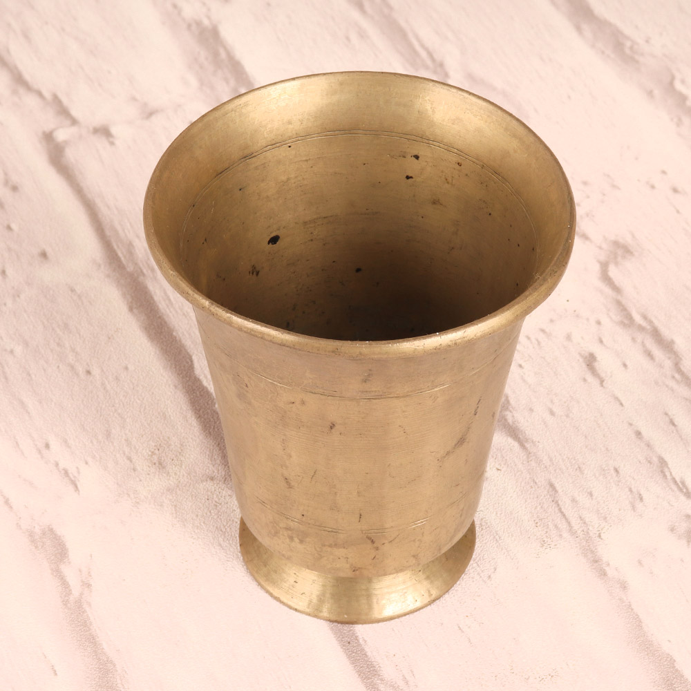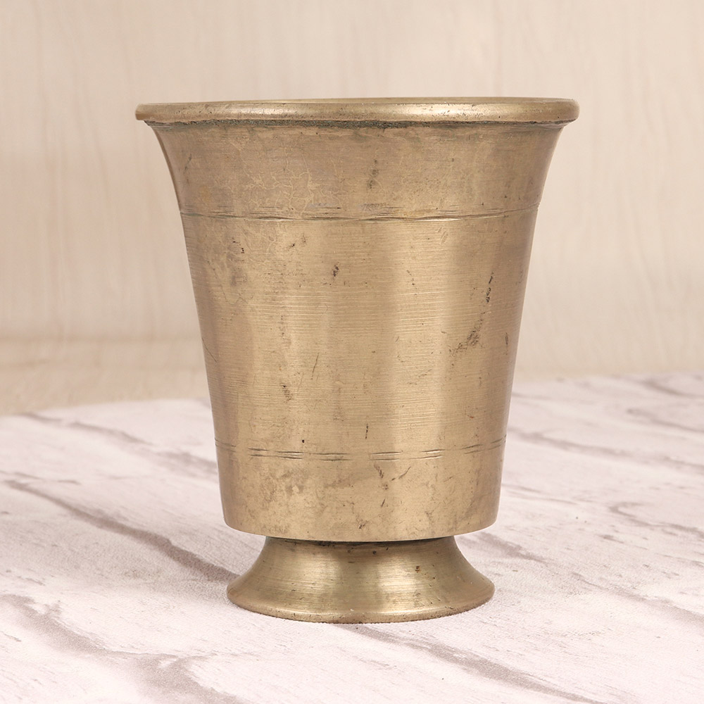 Discover the beauty and elegance of South Indian art with this stunning vintage brass holy water cup. Crafted with meticulous attention to detail, this captivating piece is the perfect addition to your home altar or ritual space. This vintage brass holy water cup is more than just a decorative accent - it's a tool to deepen your spiritual practice. Fill it with blessed water and use it to anoint your body, cleanse your space, or offer prayers. Its simple, elegant design allows it to blend seamlessly into any altar or meditation corner, serving as a constant reminder to pause, reflect, and connect with the divine. Whether you're a seasoned practitioner of South Indian traditions or simply appreciate the beauty of ancient craftsmanship, this holy water cup is a must-have. It makes a thoughtful gift for birthdays, holidays, or any occasion where you want to honor someone's spiritual journey. Elevate your rituals and infuse your space with the rich cultural heritage of South India.